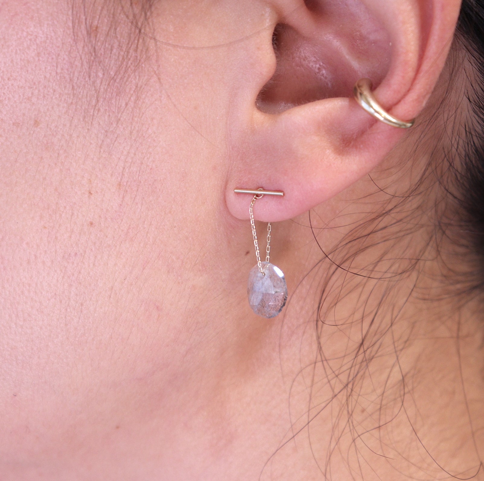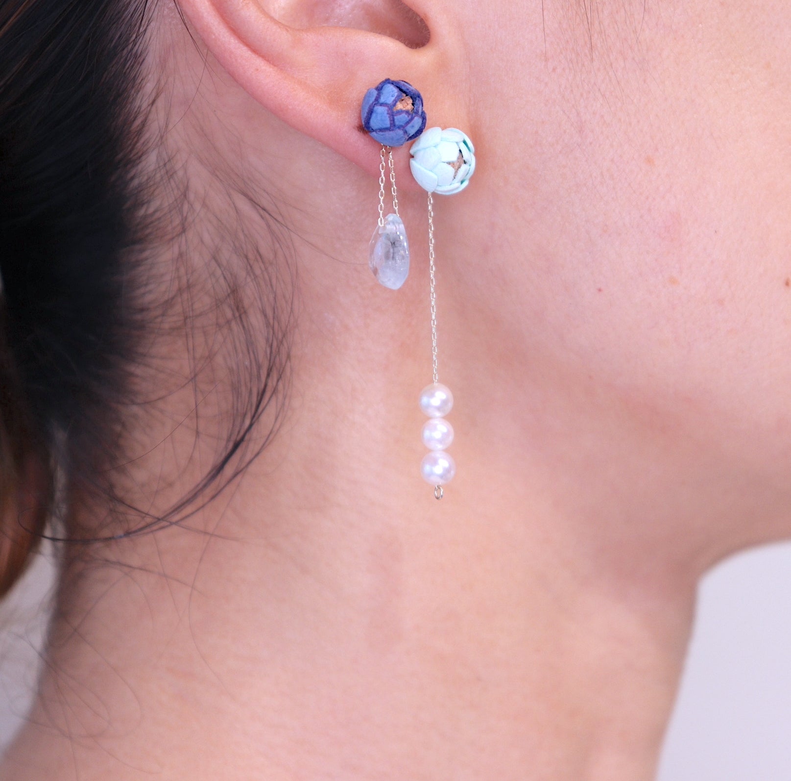 It can be used in two ways: by hanging it down by threading an earring post through the round part on one side, or by folding it over by threading it through the round parts on both sides.