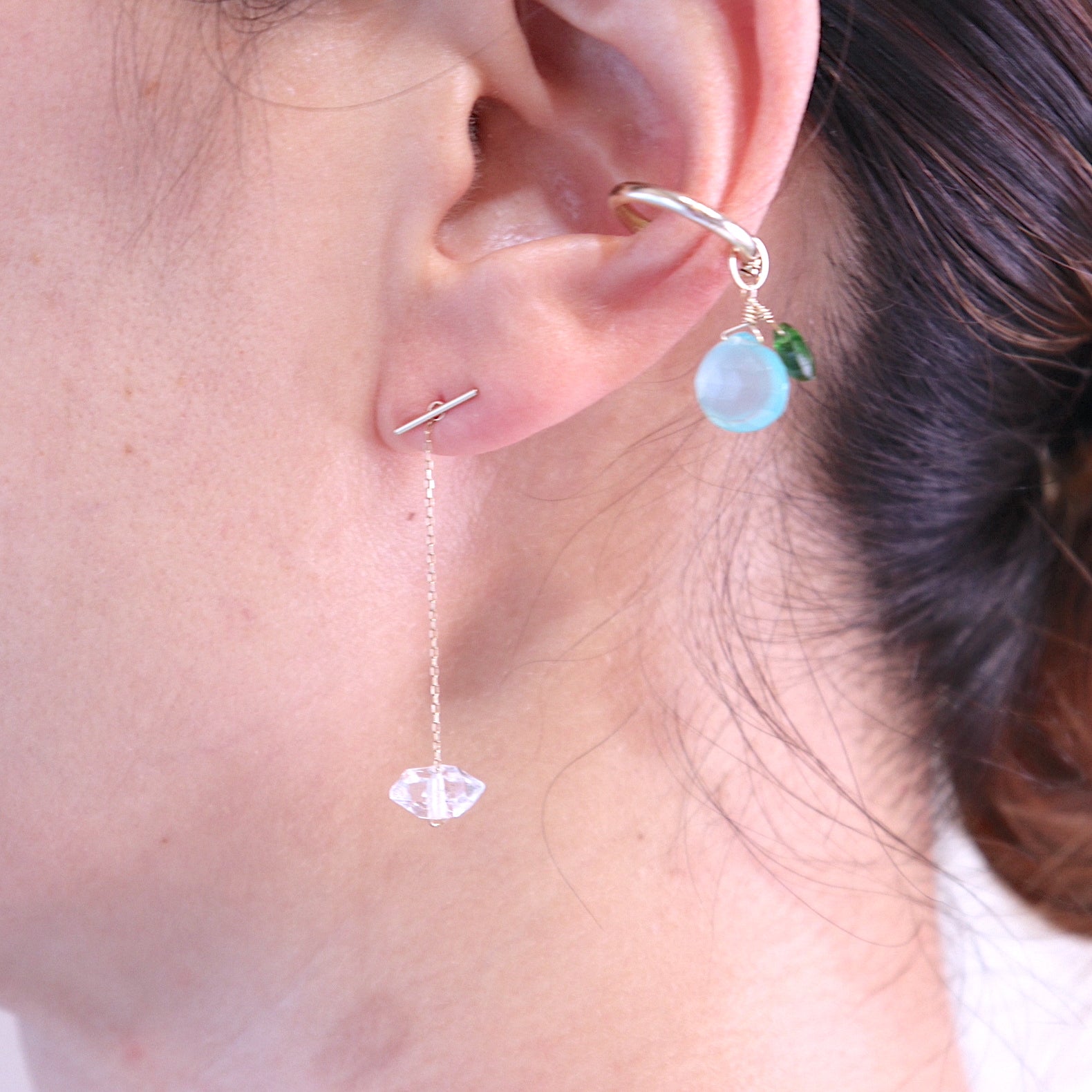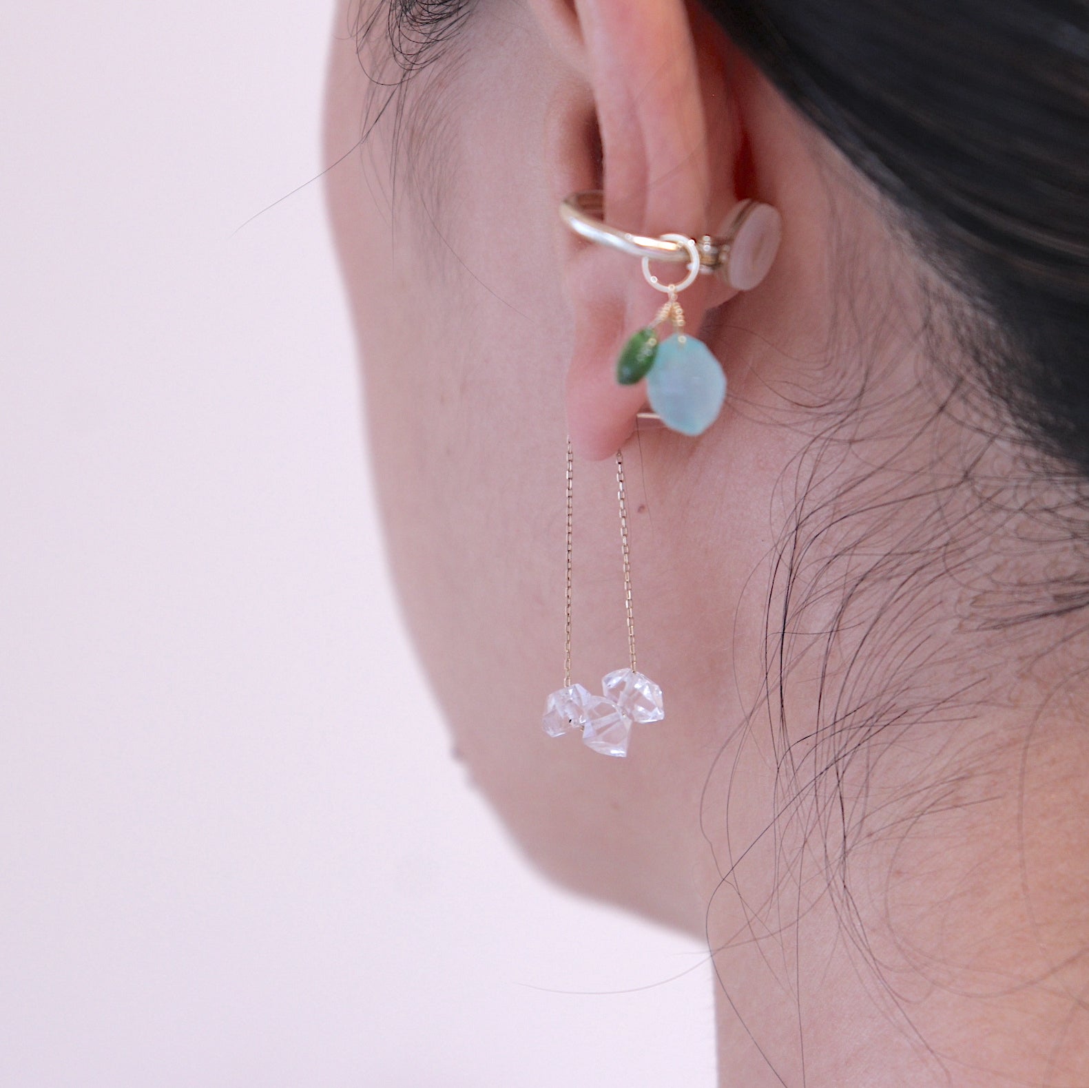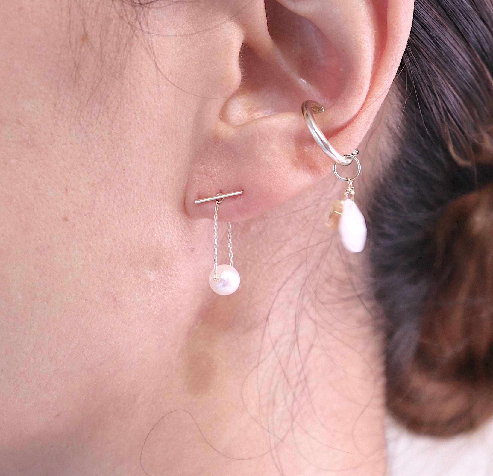 It can be used in two ways: by hanging it down by threading an earring post through the round part on one side, or by folding it over by threading it through the round parts on both sides.