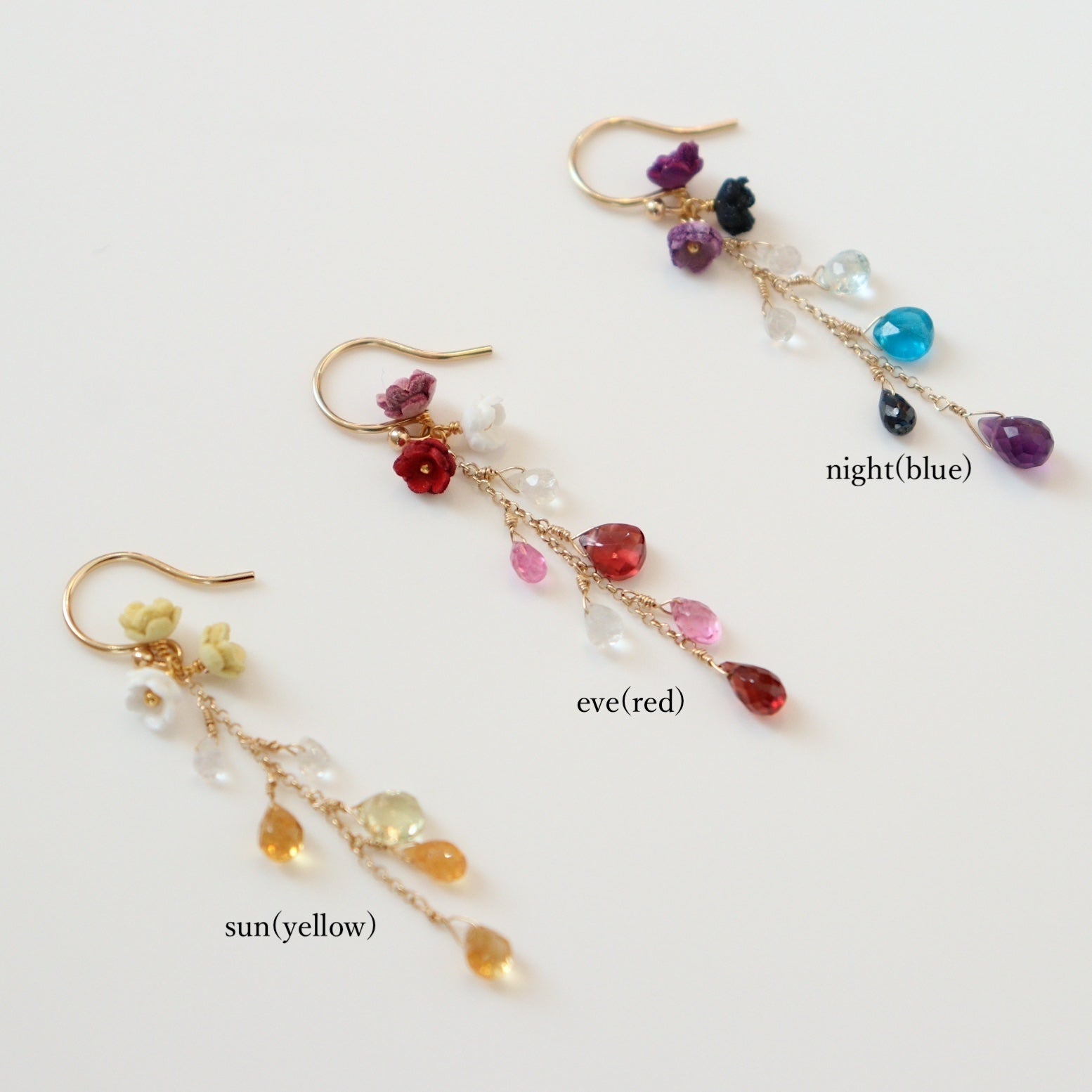 The earrings come in two types, short and long. The colorful light reflects off of them and sparkles on your skin.