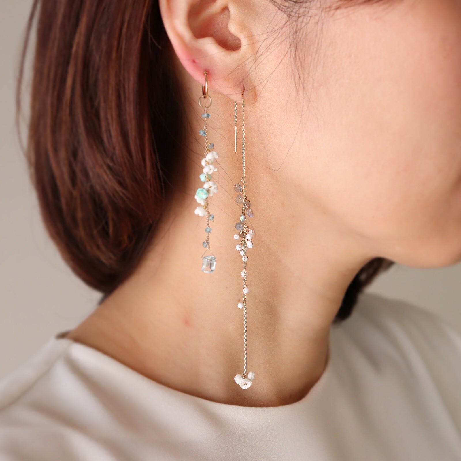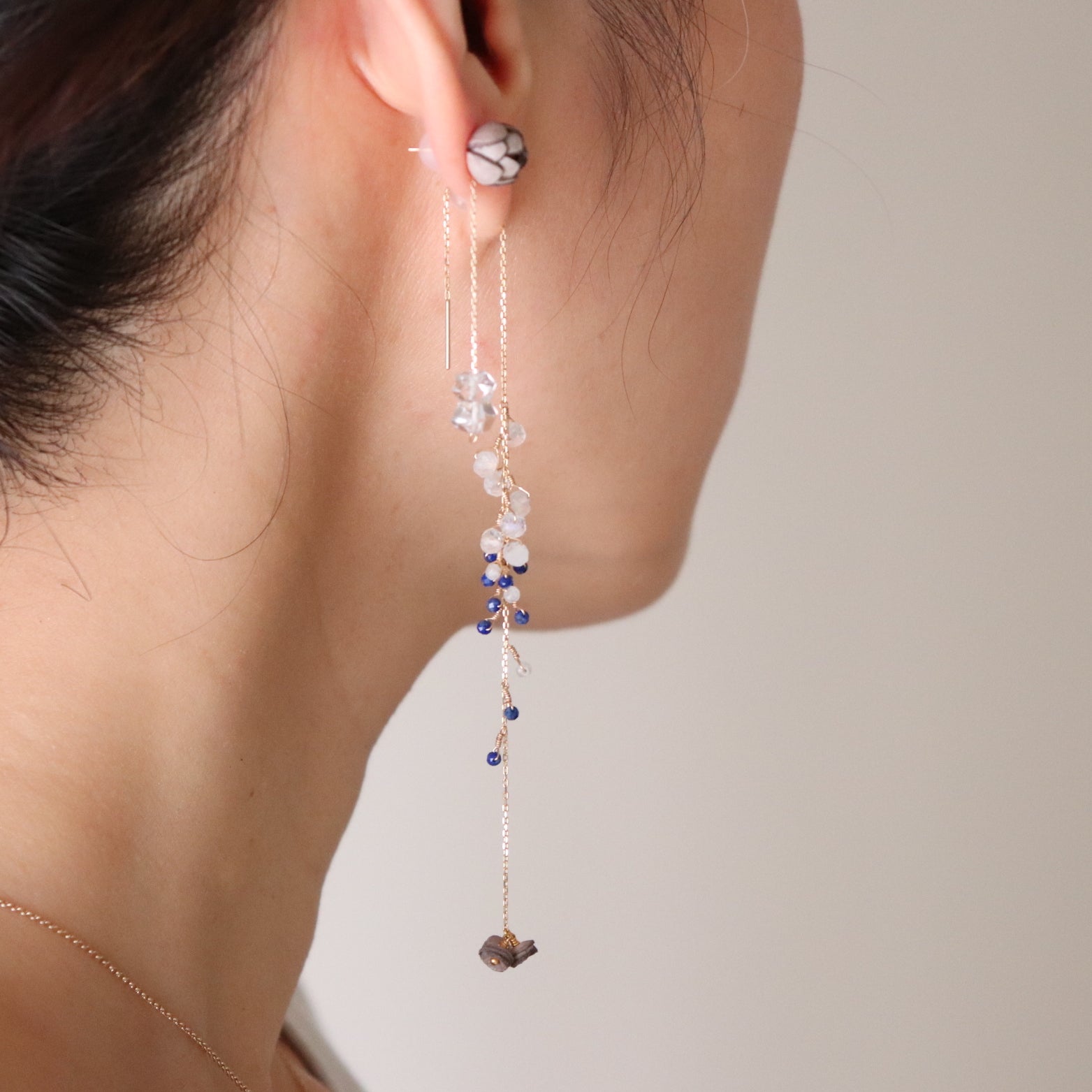 The delicate K18 chain is lavishly decorated with natural stones, and the design sways elegantly. This series was created with the image of rain made of natural stones. You can wear it at your desired length by passing the silicone catch through the middle of the chain and changing its position. Comes with a K18 silicone catch.