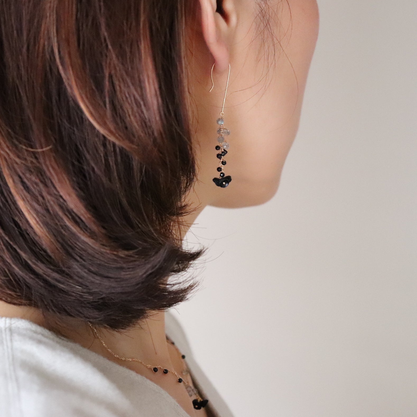 black / Leather, K18, K14GF wire, black spinel, labradorite