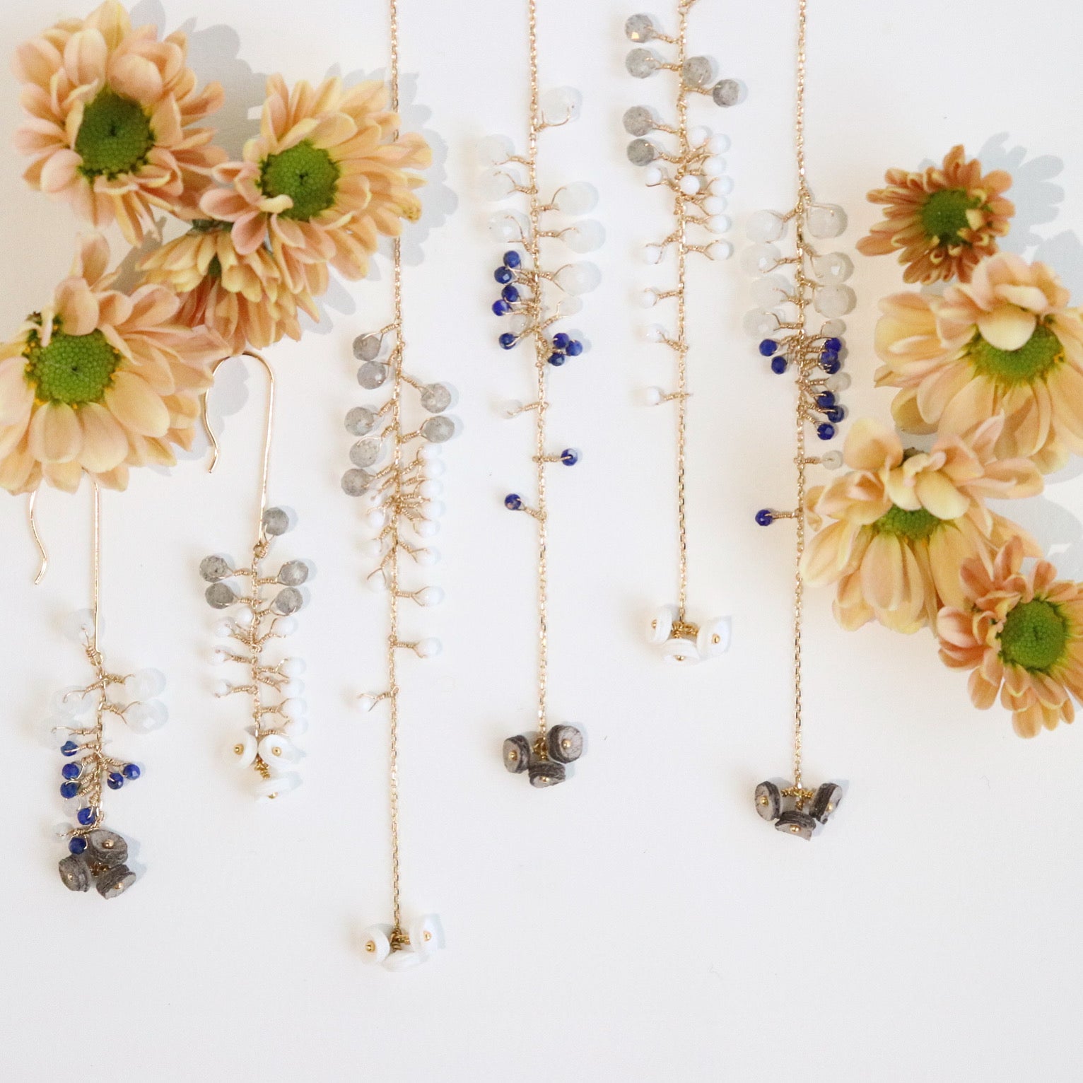 The delicate K18 chain is lavishly decorated with natural stones, and the design sways elegantly. This series was created with the image of rain made of natural stones. These are sturdy hook-type earrings.