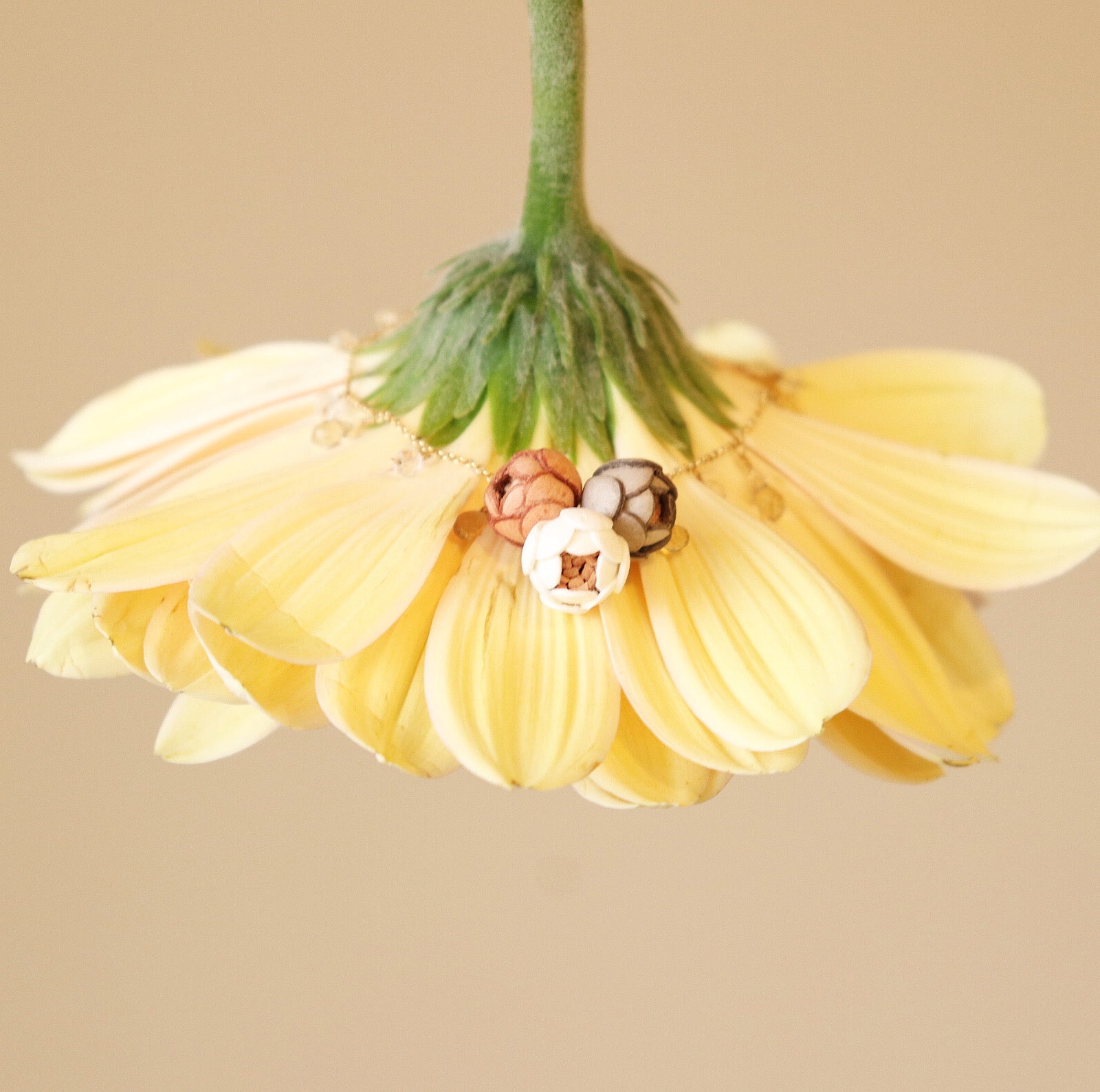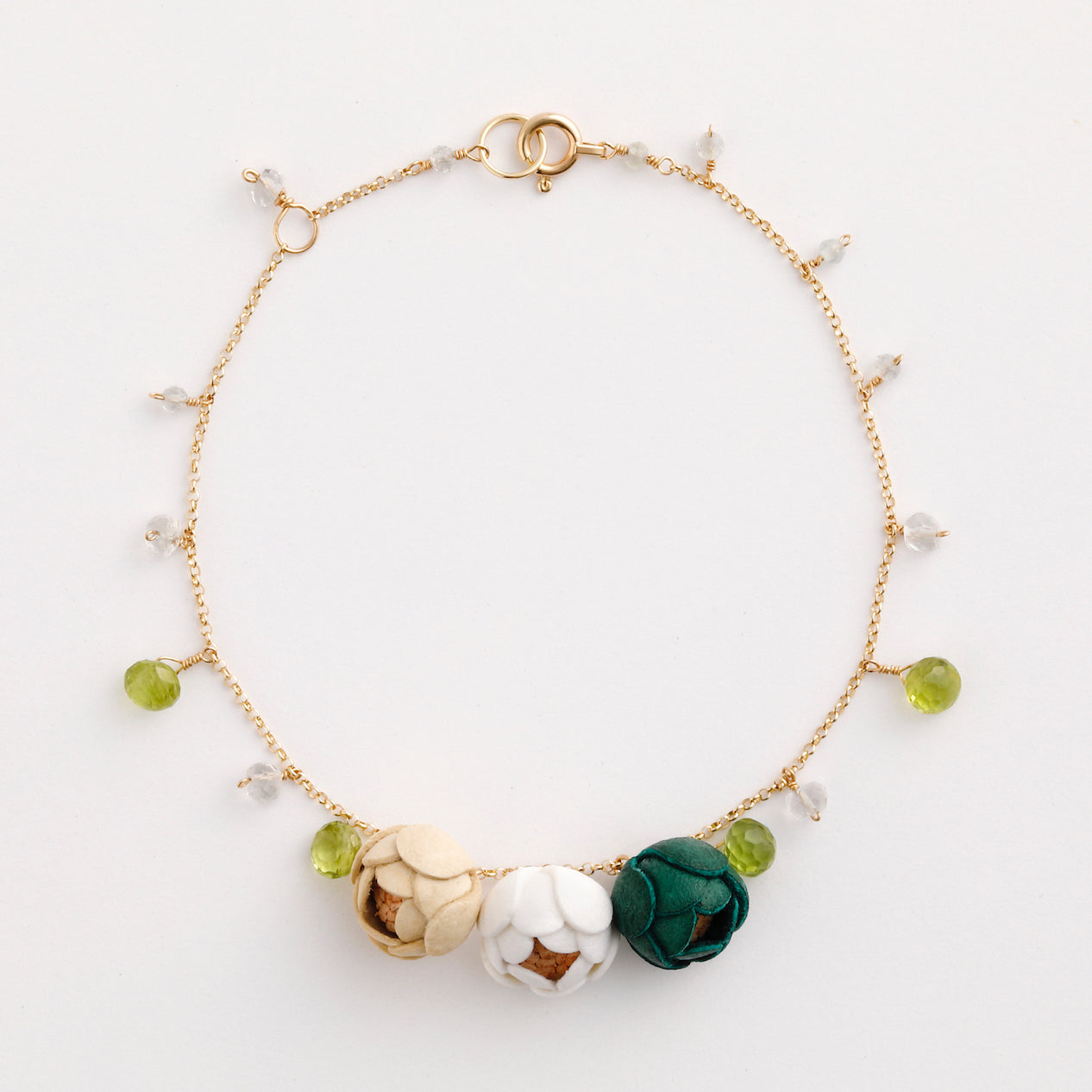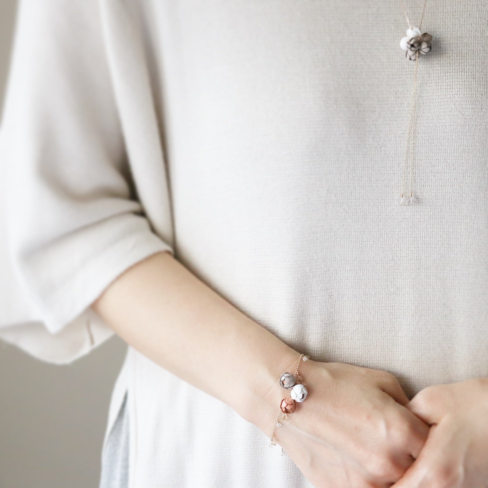 Transparent natural stones and flowers in three colors will decorate your wrist. This bracelet is made of pale pastel colors that are gentle on the skin. Custom sizes are available.