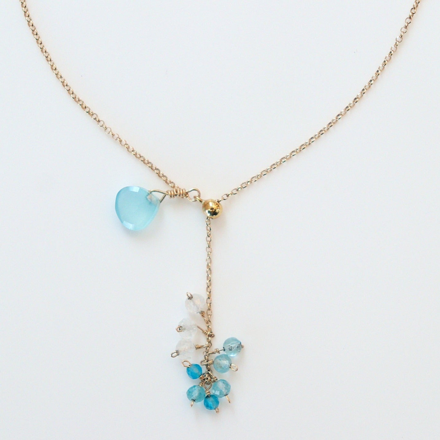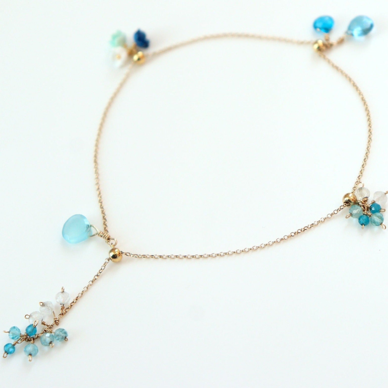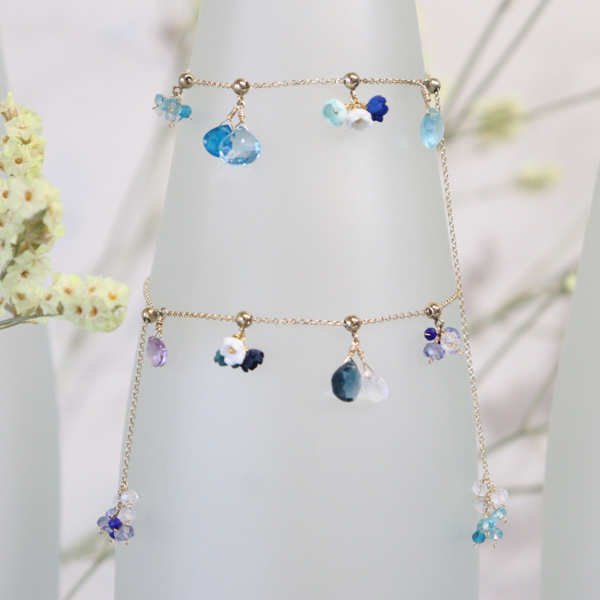 Blue: K10YG, K14GF, leather , Swiss blue topaz , apatite, blue chalcedony , buttons: moonstone , apatite (2 types )