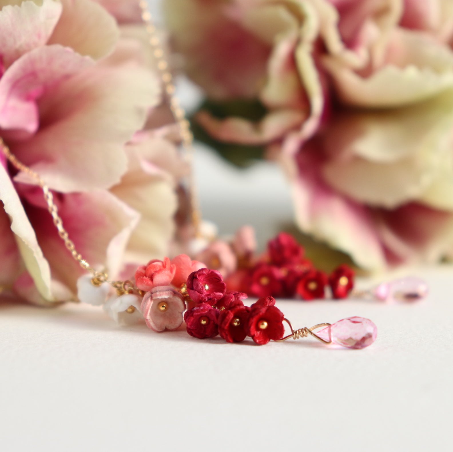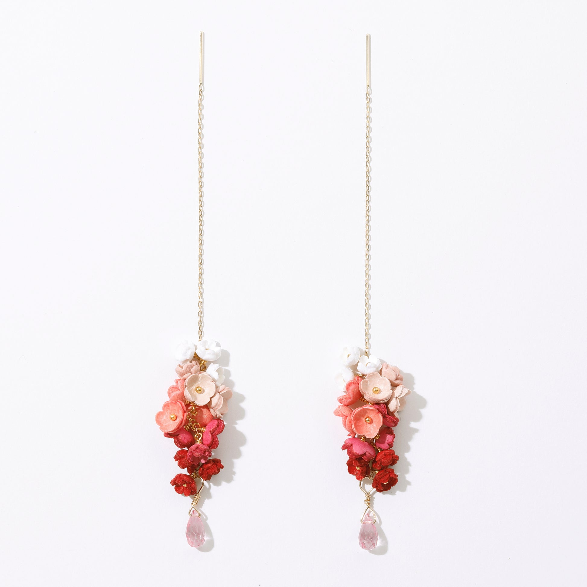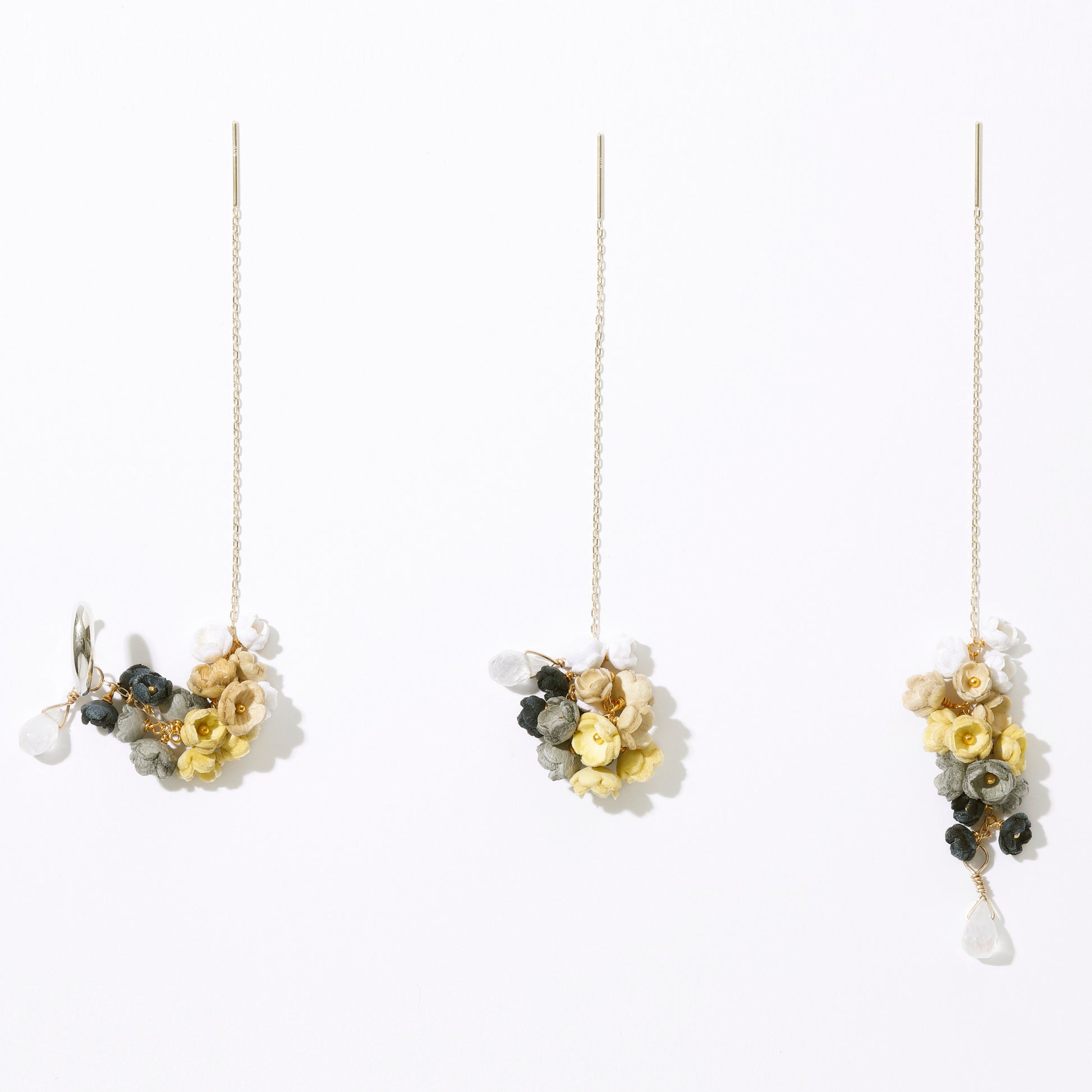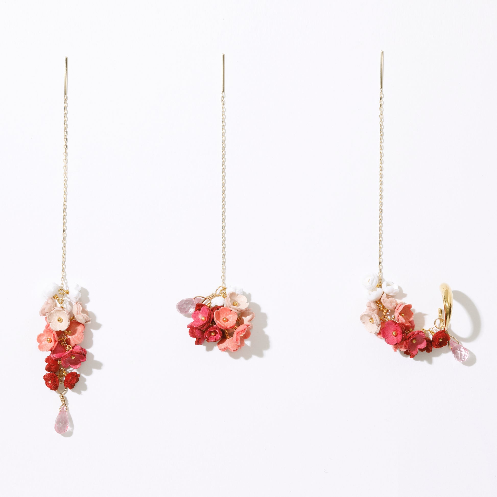 「結」をコンセプトにした「YUI」シリーズのピアス。「結」には、「バラバラなものが繋がりあって、一つになる」や「互いに助け合い、協力する仲間」という意味があります。5色の大小のグラデーションの花々が連なり、耳に寄り添うように繋がっていく様を表しました。