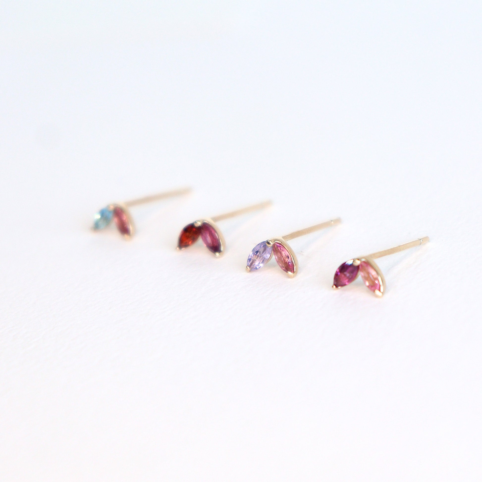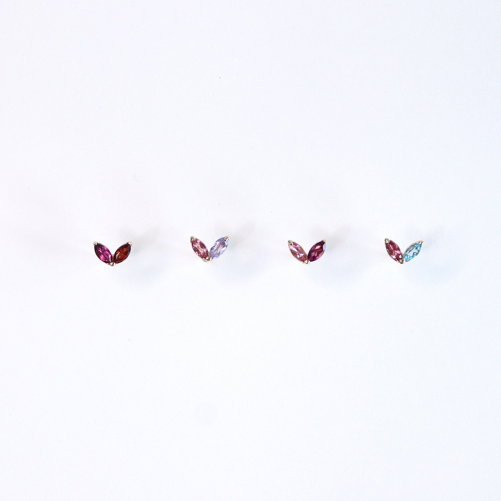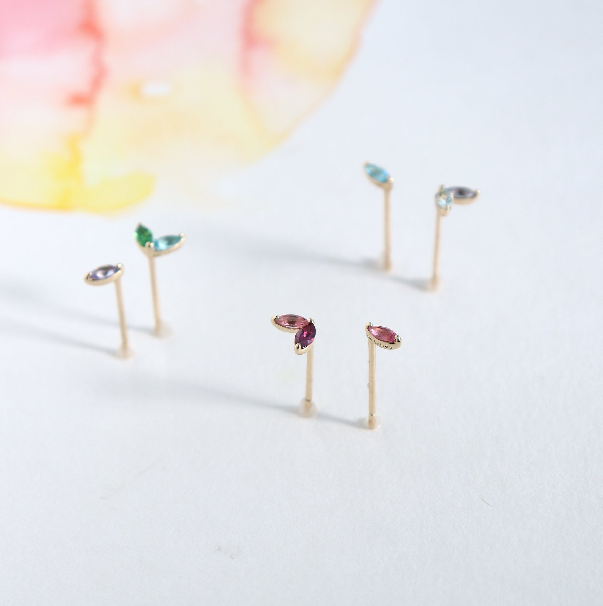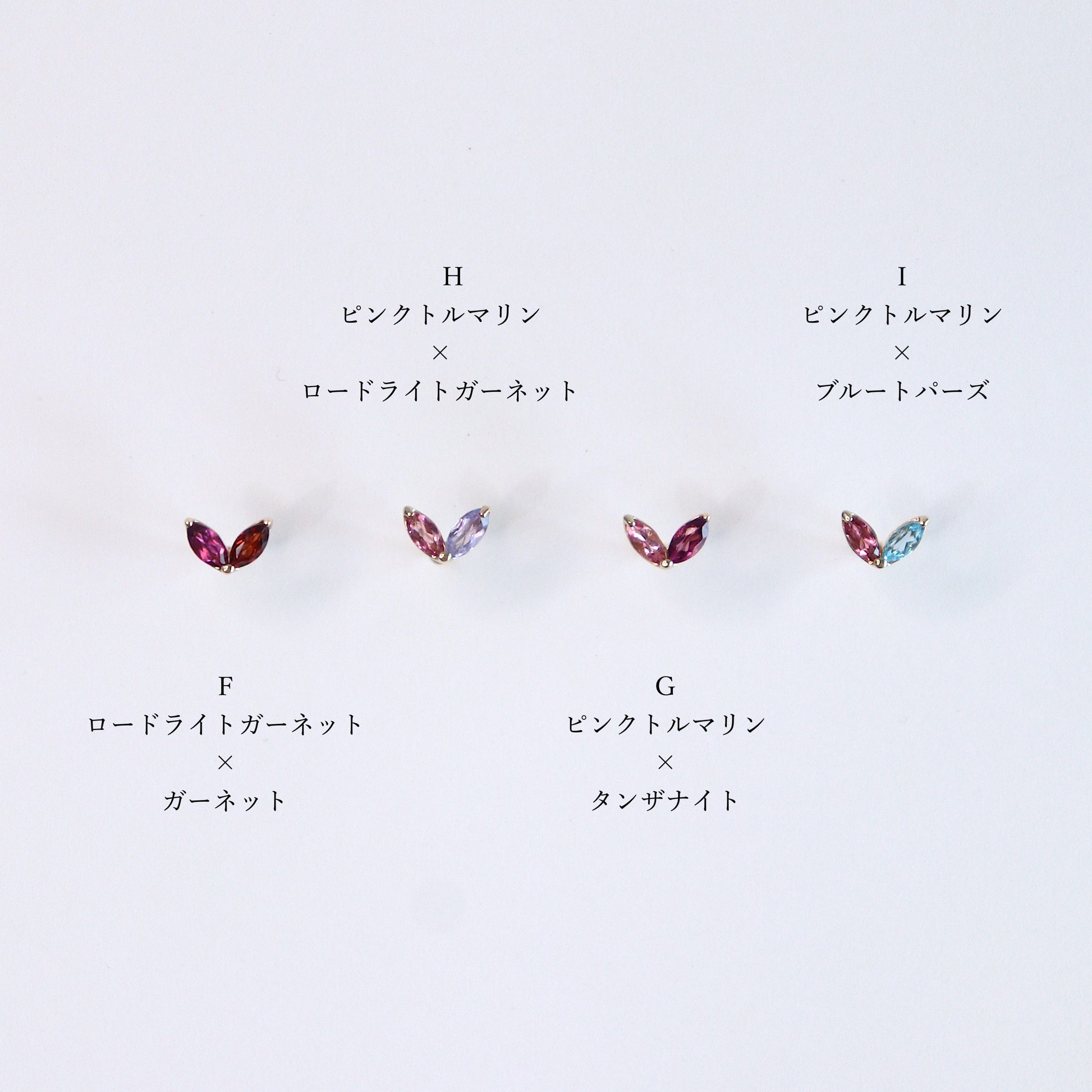 葉のような小さなマーキスカットの天然石を2石あしらった華奢なデザインピアスは、日常使いにもおすすめです。