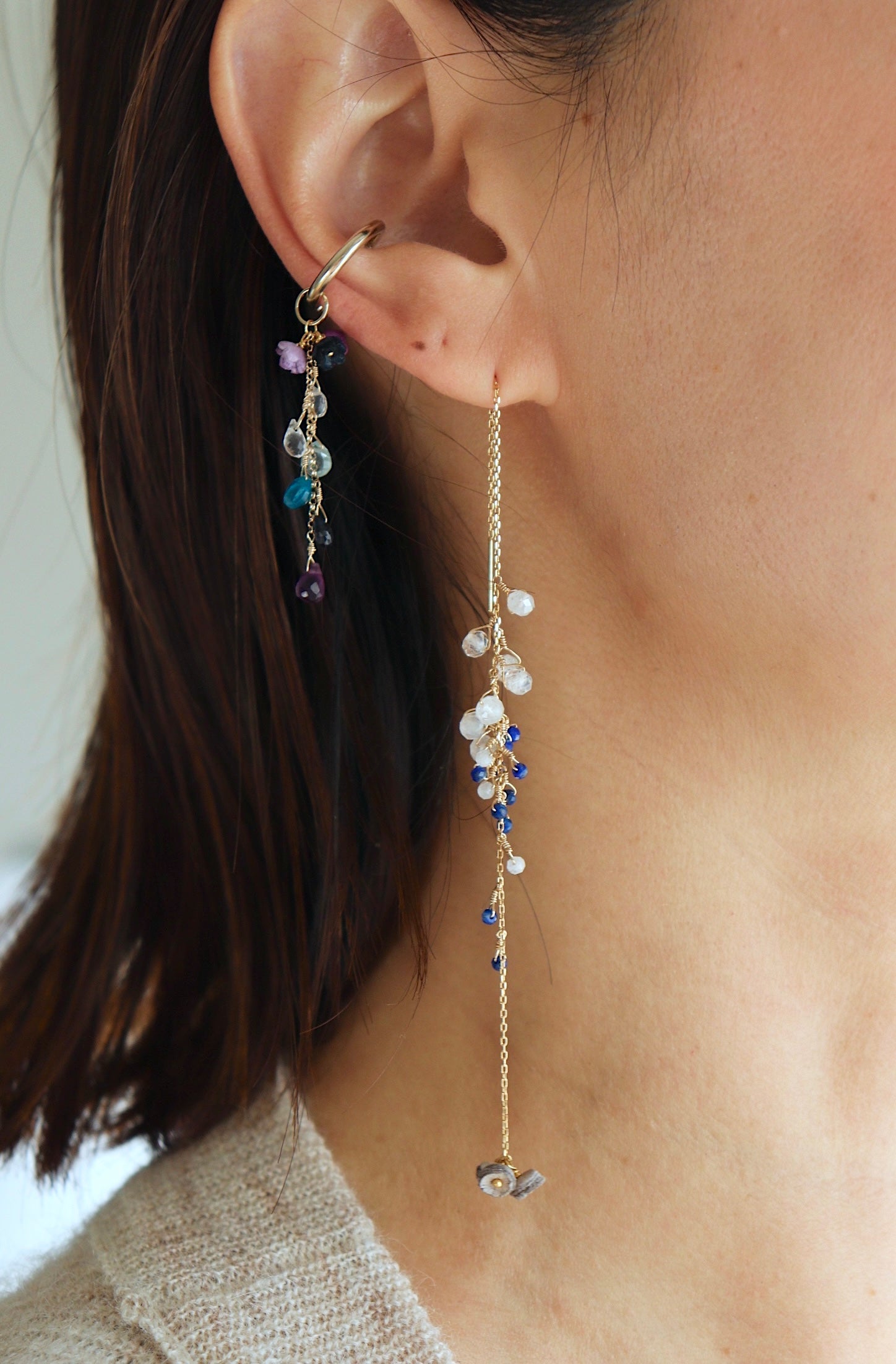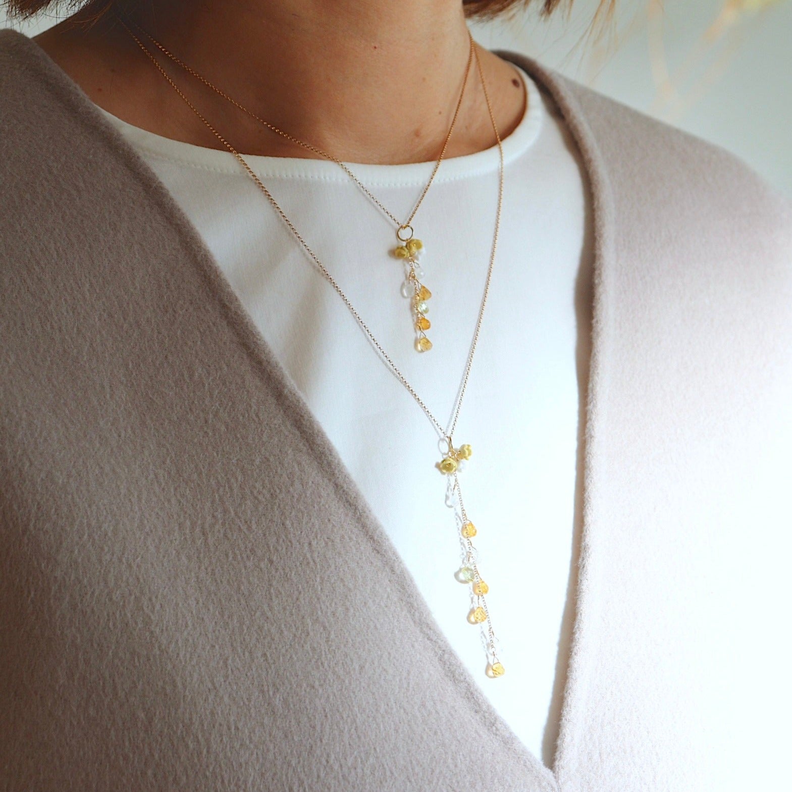 チャームはショートとロングの2タイプ。色とりどりの光の反射が、お肌の上で煌めきます。