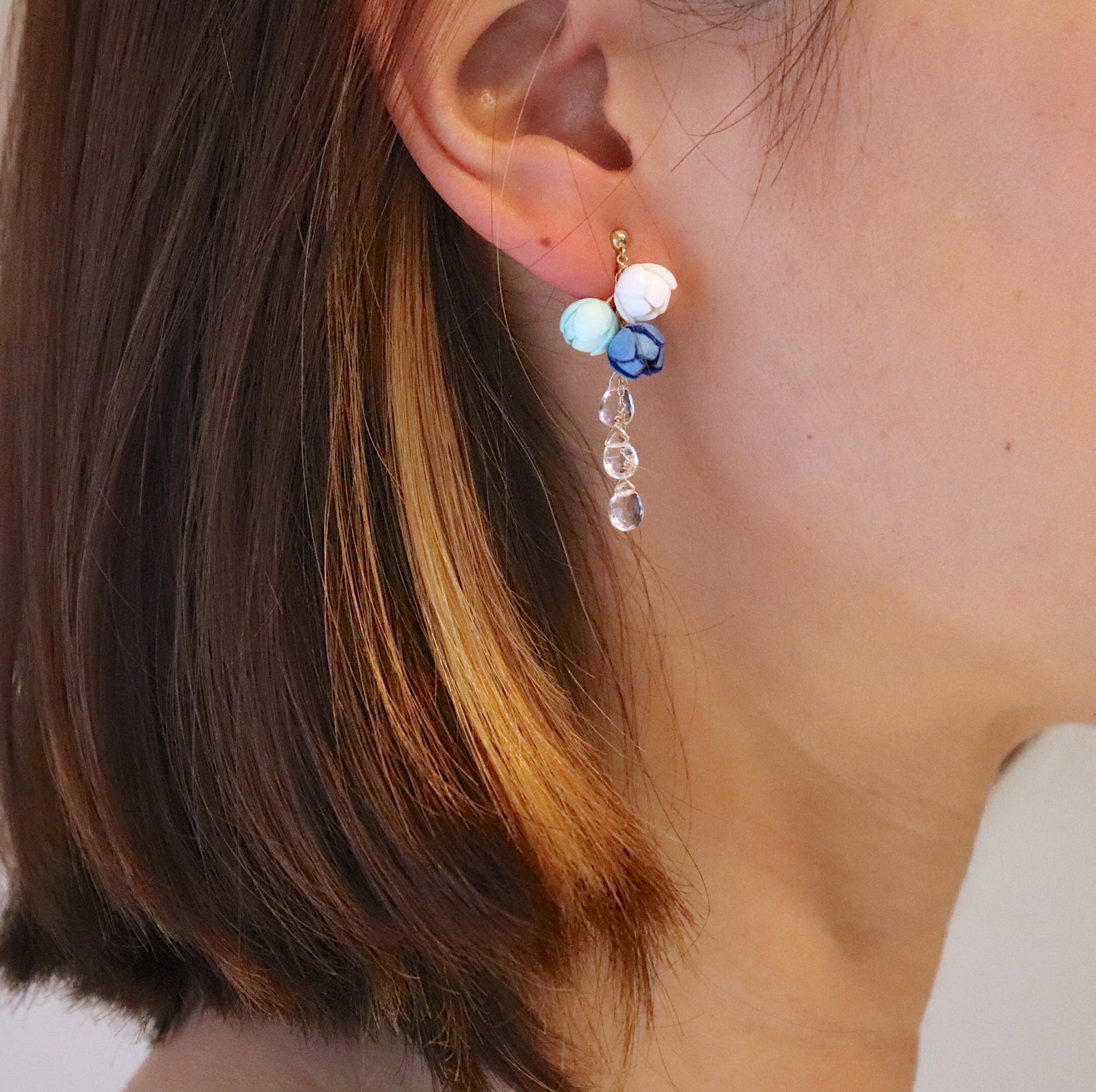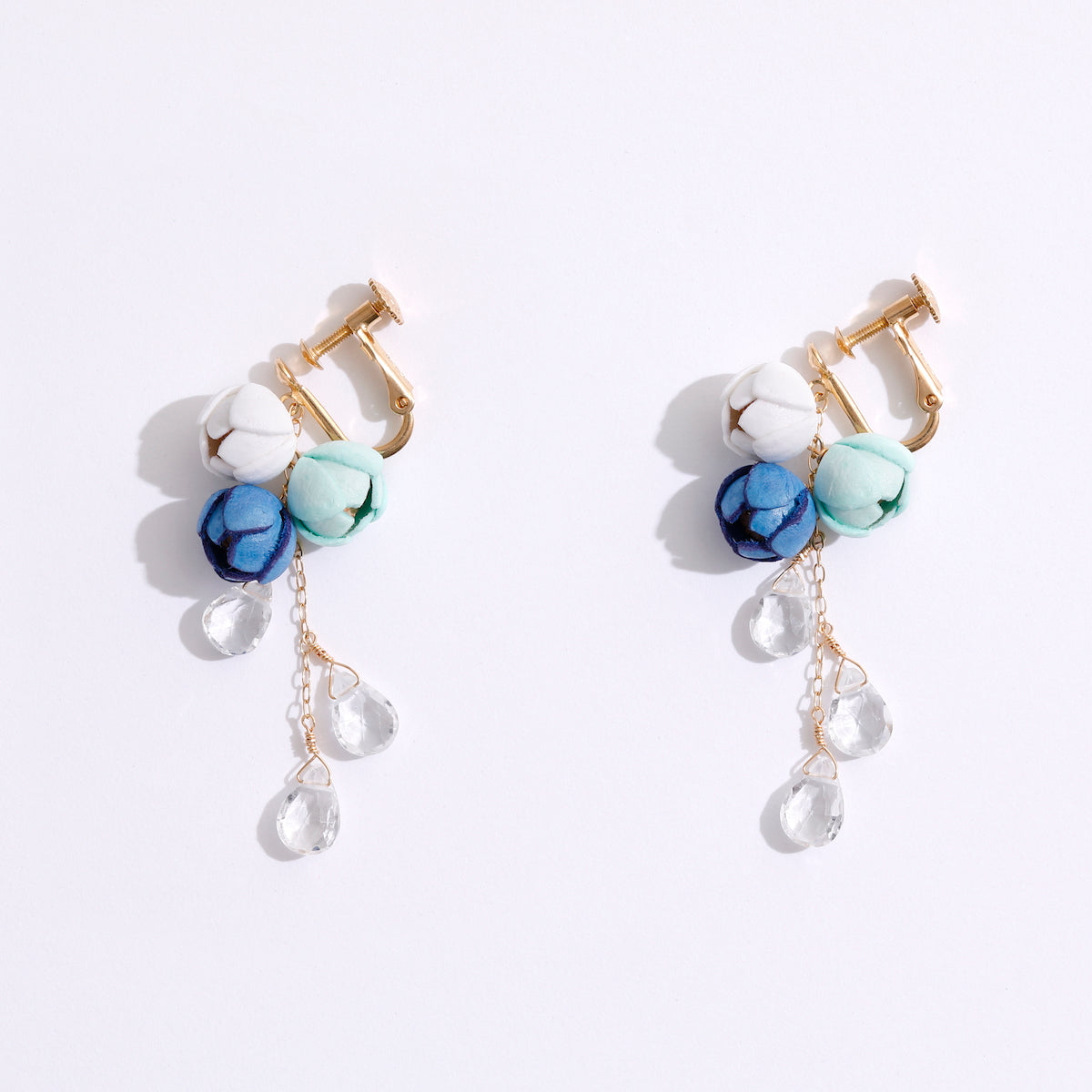 海の透明感溢れるゆらめきがテーマのMarineシリーズ。 爽やかな3色のお花と透明度の高いホワイトトパーズを組み合わせました。 太陽の日差しを綺麗に反射させ、お顔周りを華やかに演出してくれます。 イヤリングは、厚みを調整可能なネジバネ式です。