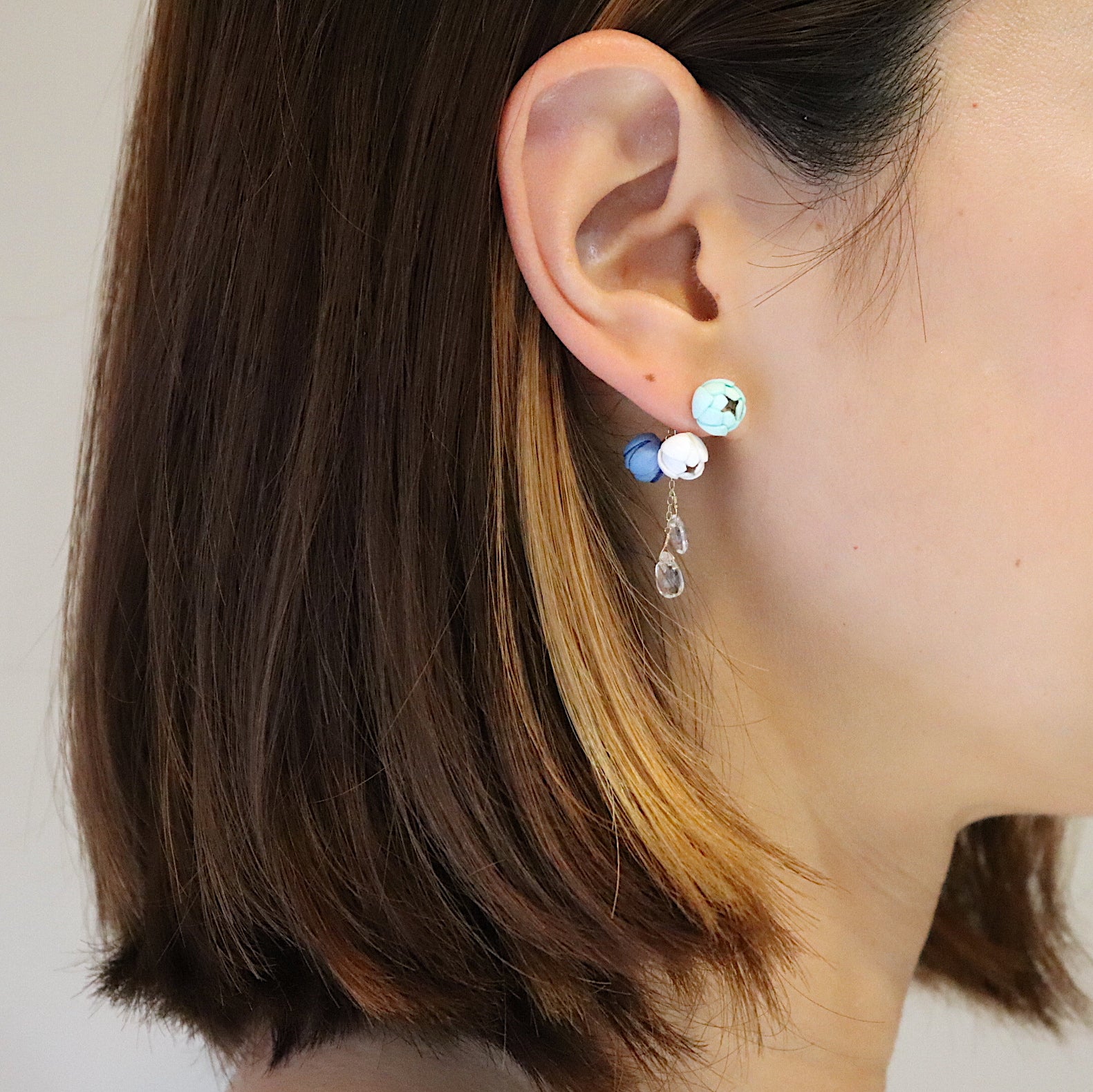 キャッチには、白とブルーのお花とホワイトトパーズの天然石が付いています。 ピアス本体のみ着用したり、お手持ちのピアスにキャッチを付けたり、アレンジをお楽しみ頂けます。