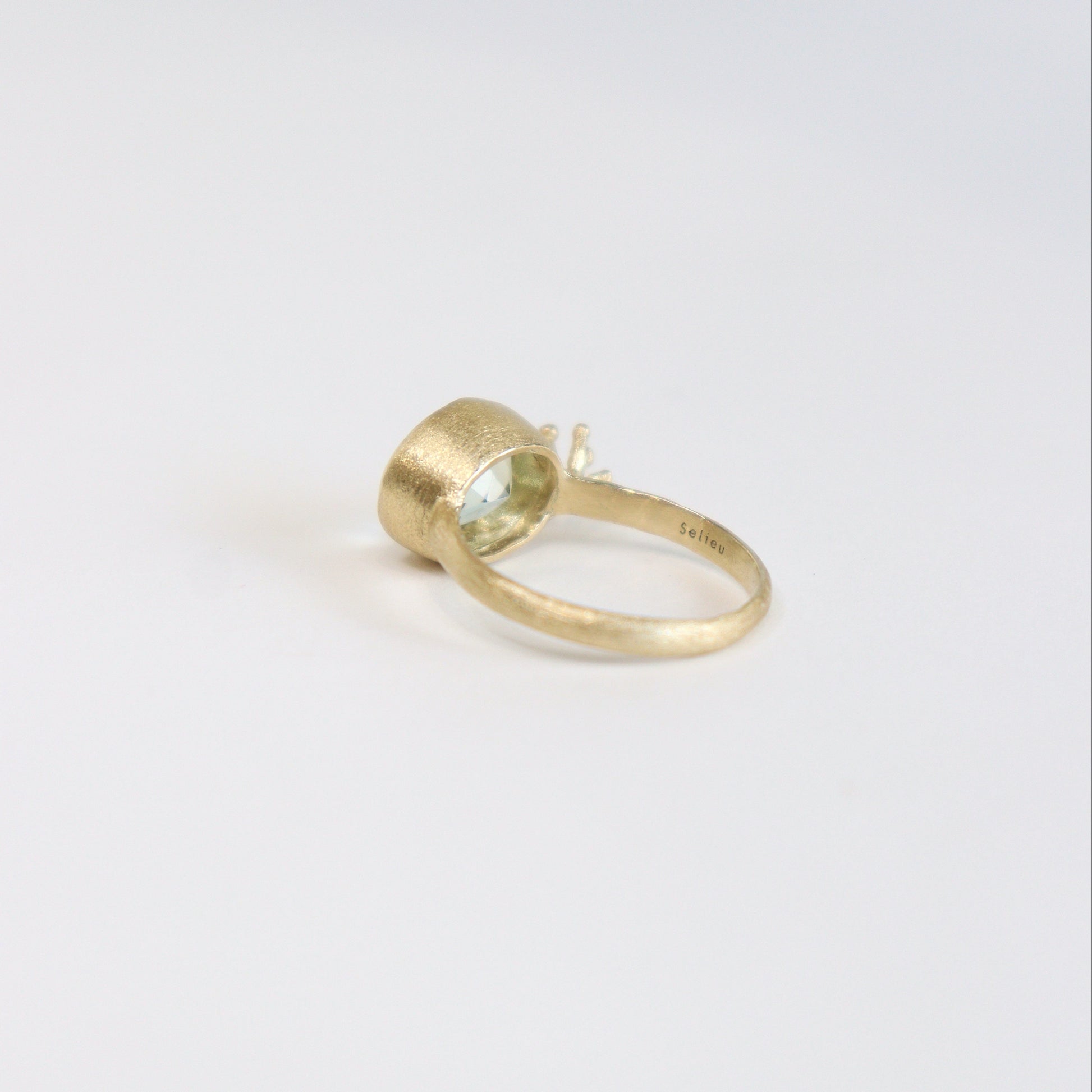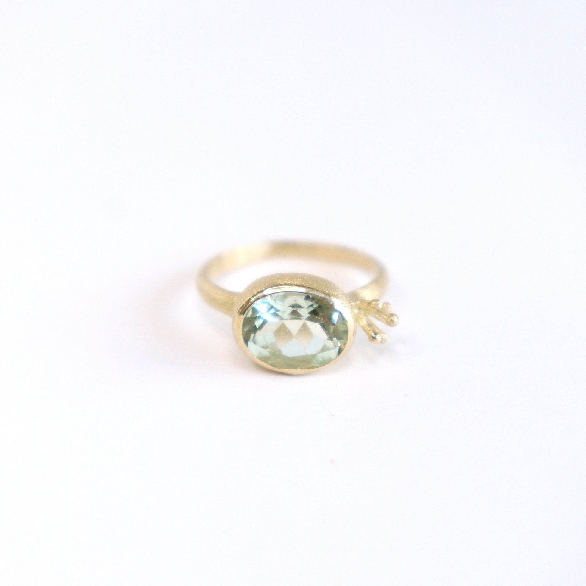 10×8mmサイズのボリュームたっぷりのオーバル型のグリーンクォーツをシンプルにフクリン留めにし「スキミア」の小さなツンツン飾りが個性を添えてくれます。