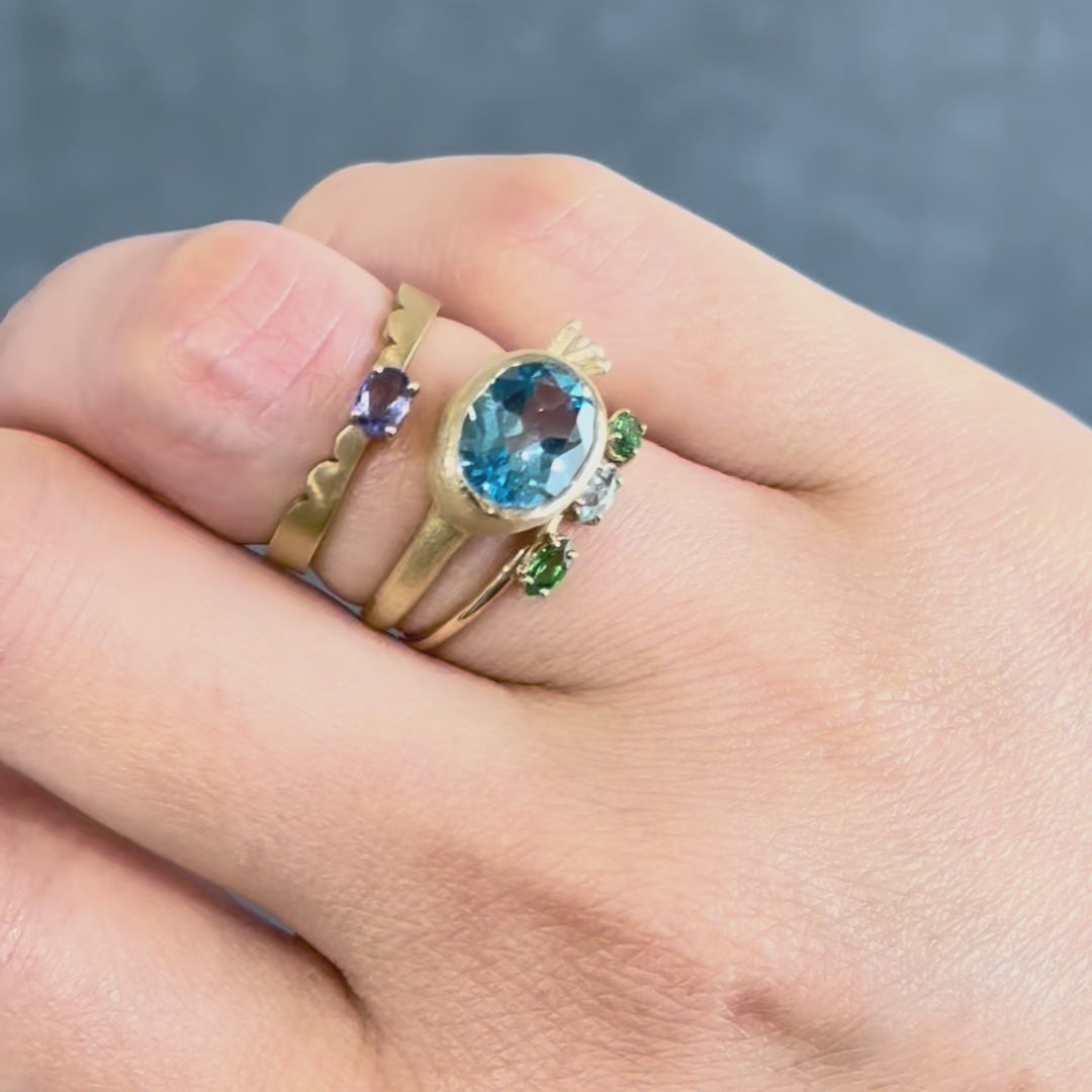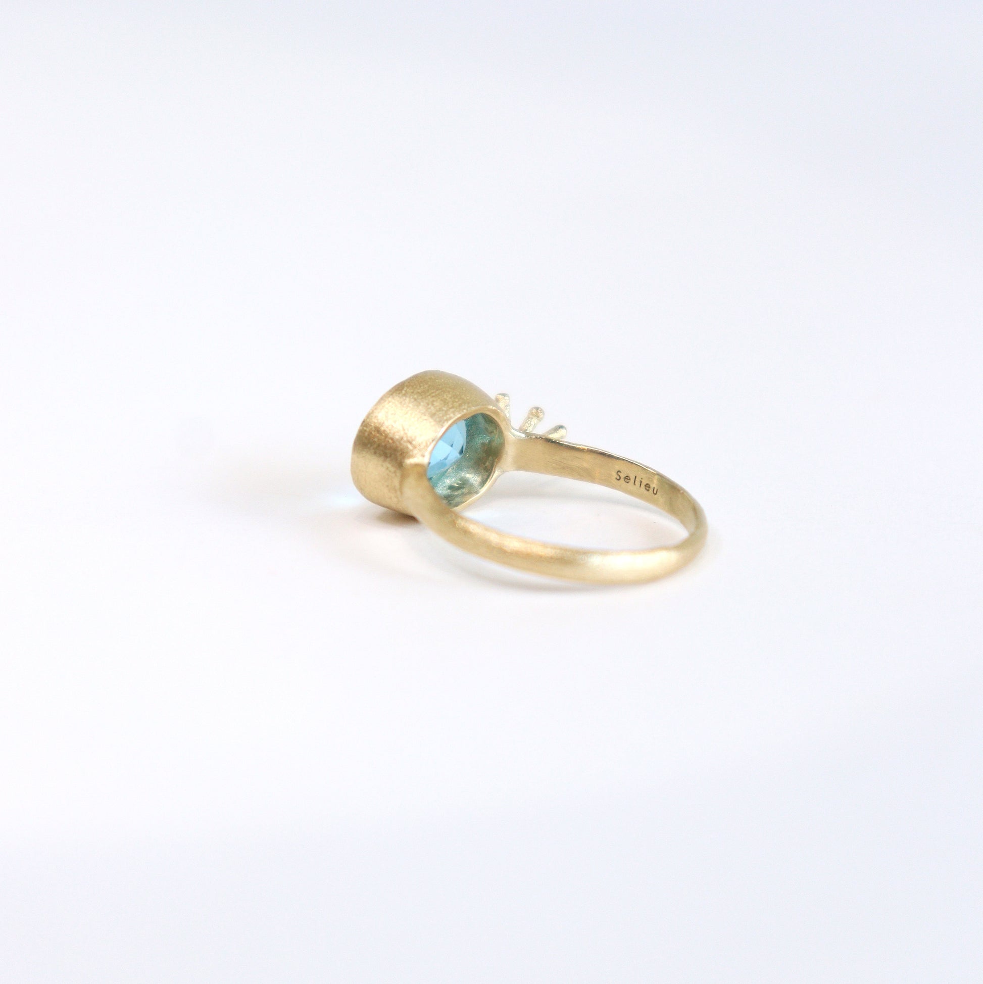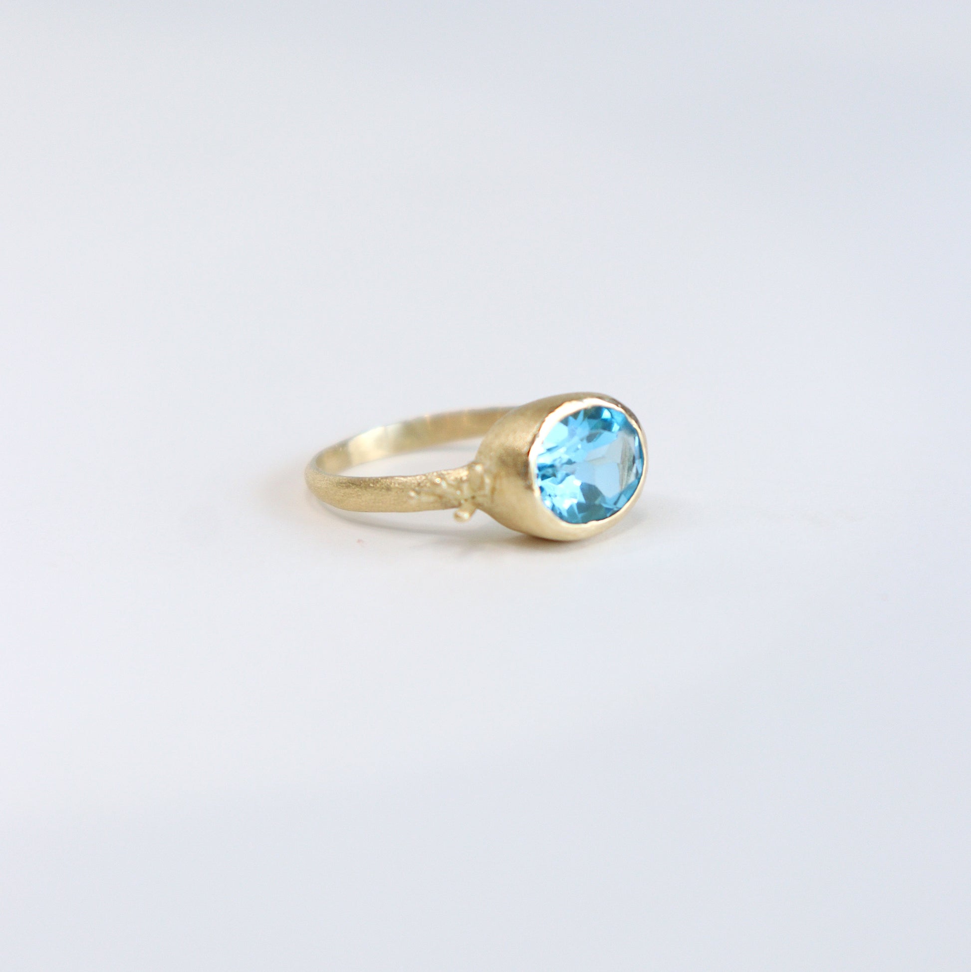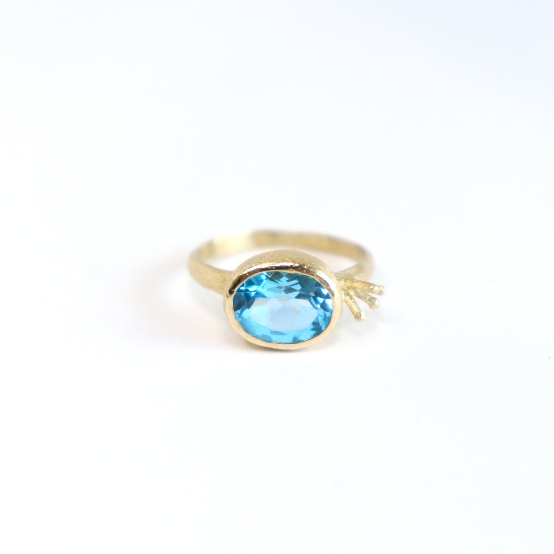 10×8mmサイズのボリュームたっぷりのオーバル型のスイスブルートパーズをシンプルにフクリン留めにし「スキミア」の小さなツンツン飾りが個性を添えてくれます。