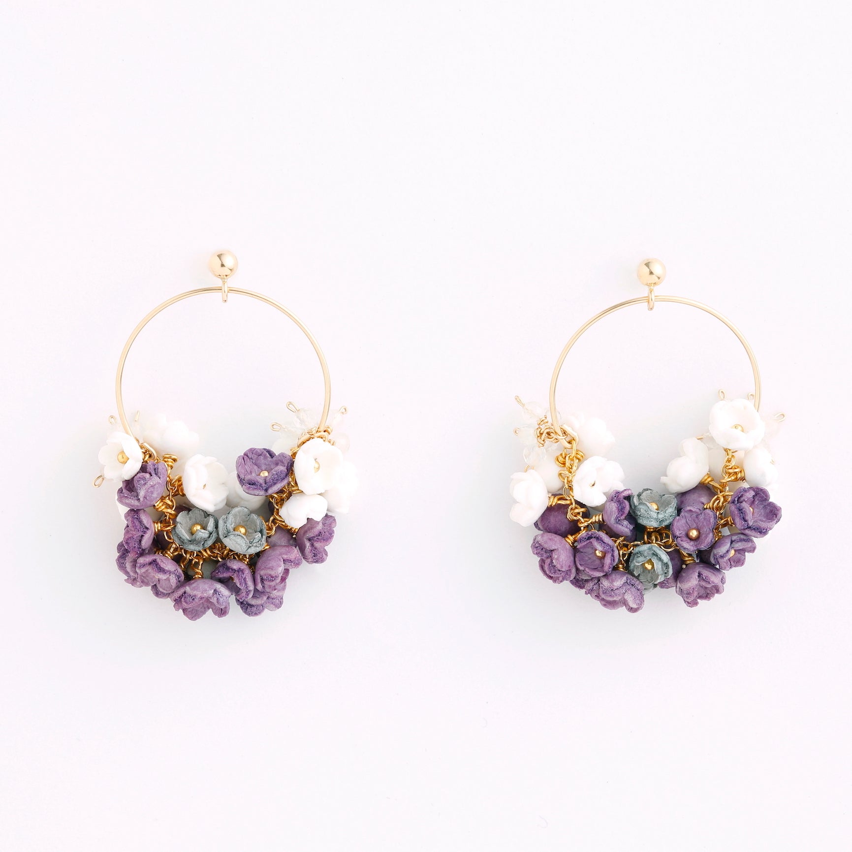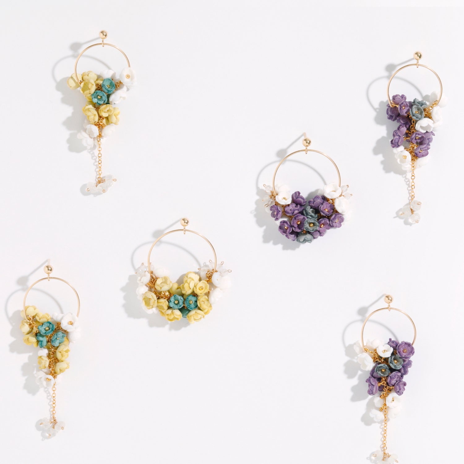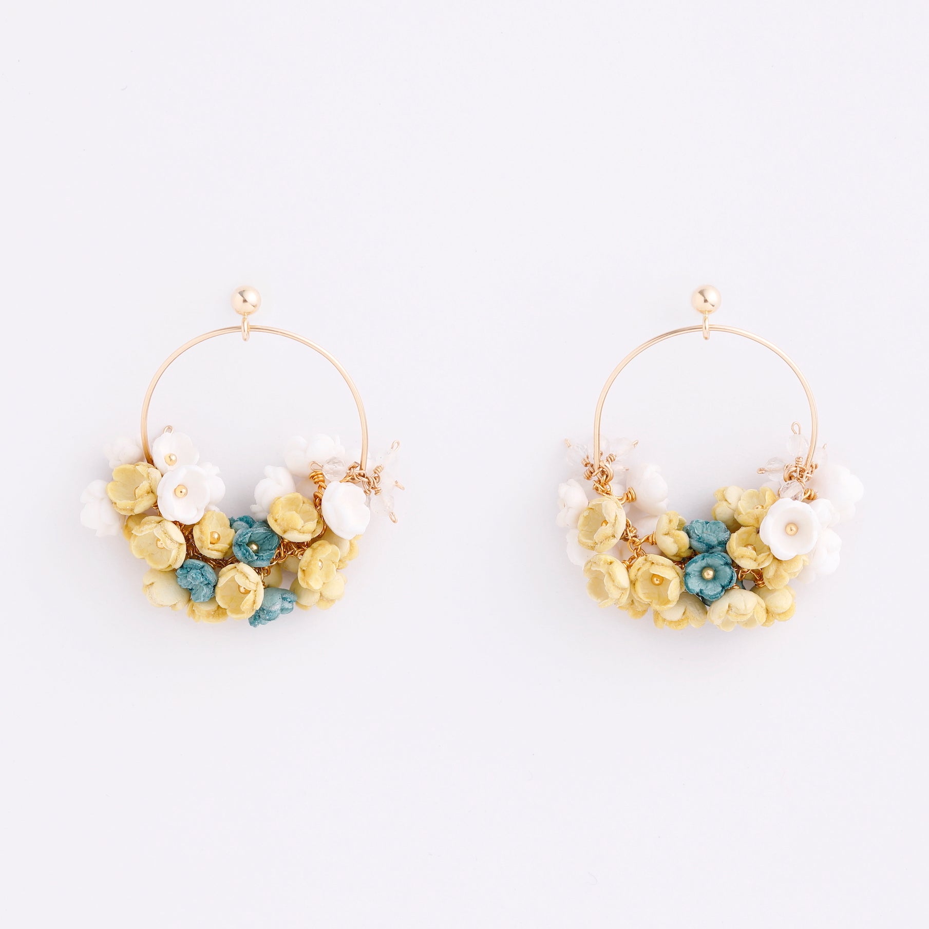 ミモザのお花モチーフ。 フープの下半分はチェーンになっており、ボリュームのあるお花が優しく揺れ動きます。