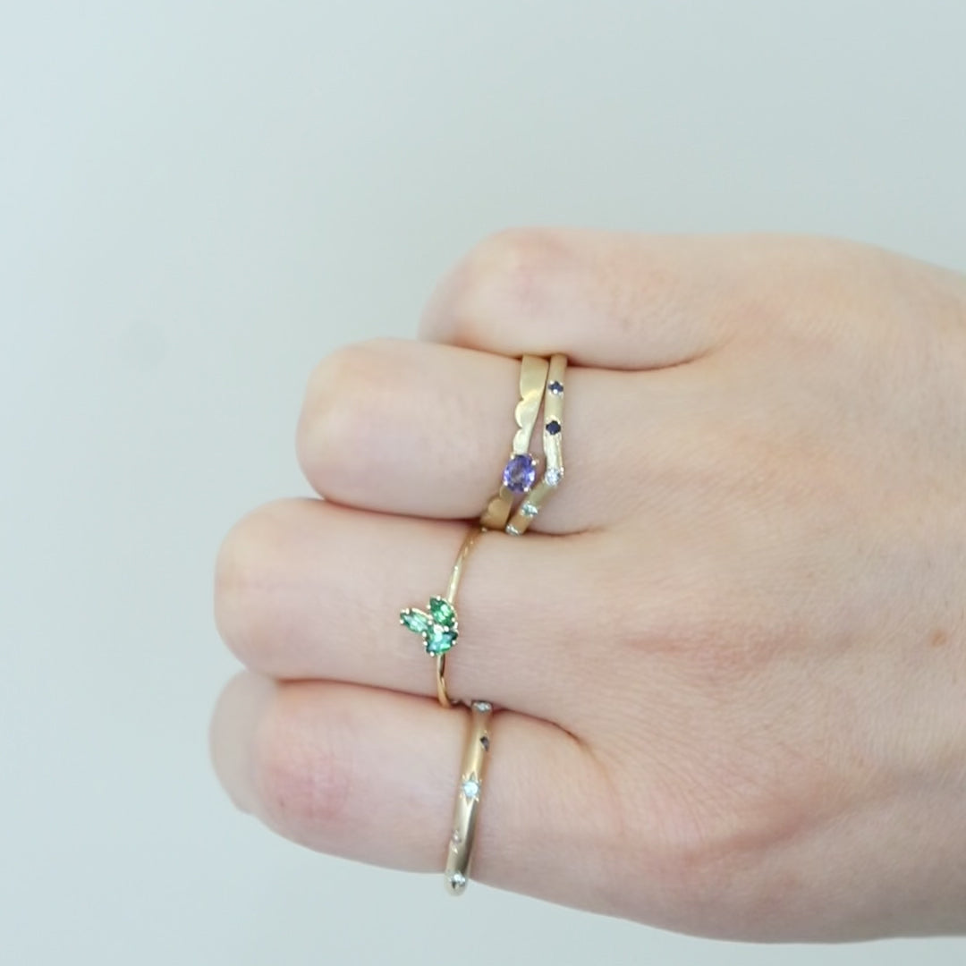 小さなオーバルの天然石から、モコモコと葉っぱが生えたような丸いシルエットが伸びていく優しいイメージのリング。マットな質感で仕上げており、可愛くなりすぎず合わせていただけます。