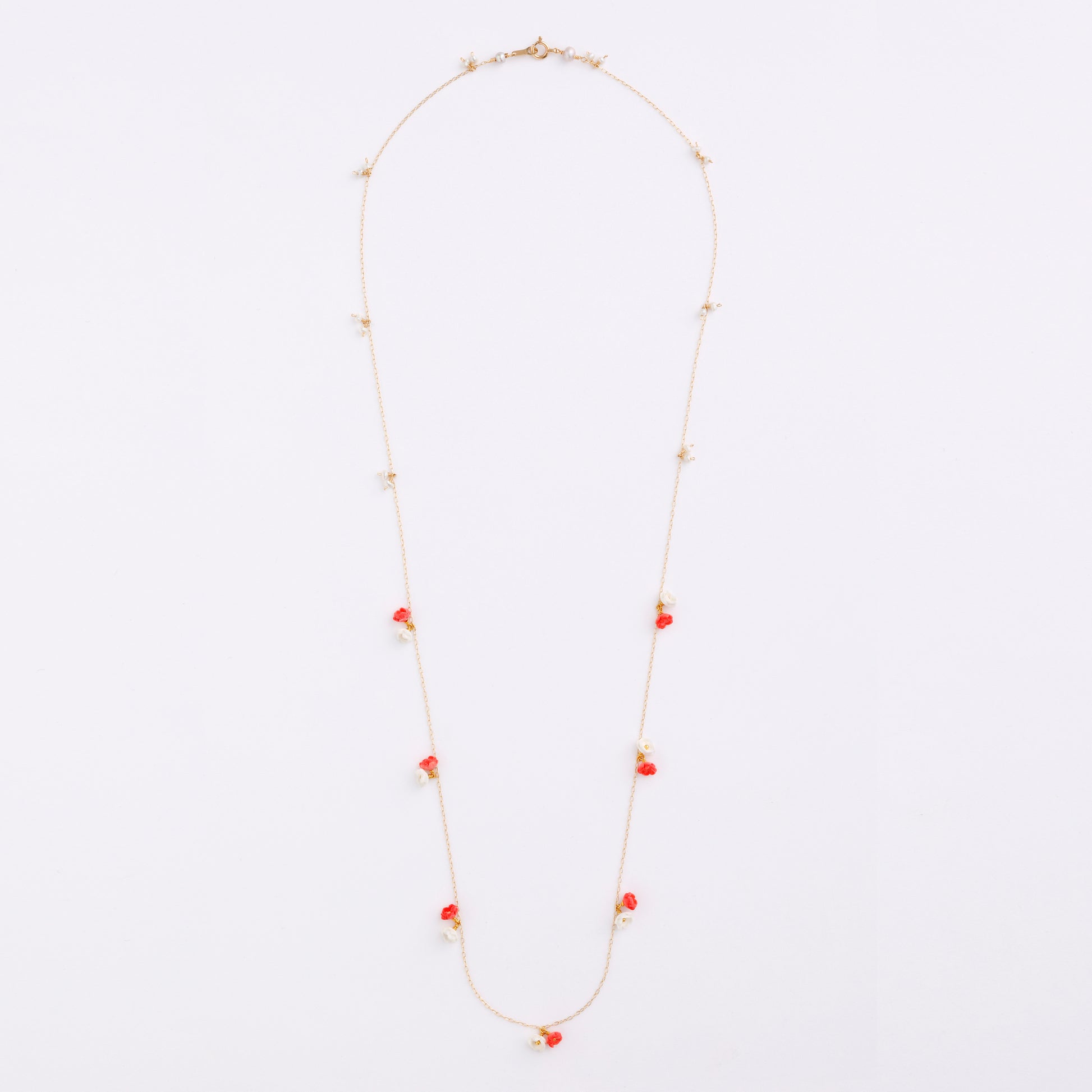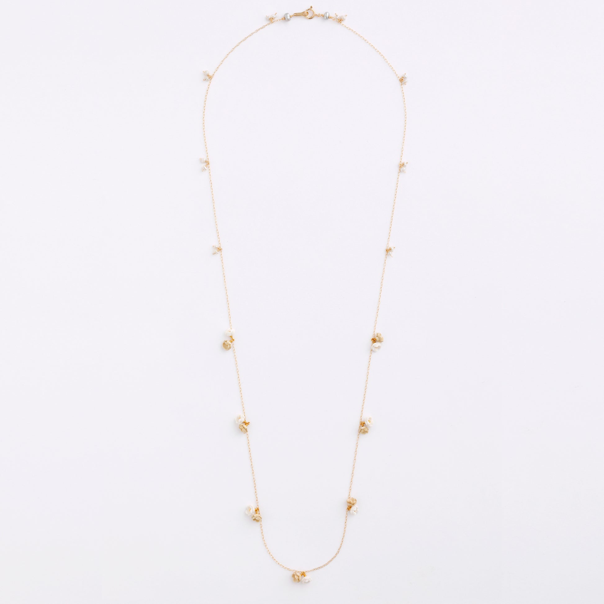 小さなお花とパールが等間隔に配置されたシンプルながらも存在感のあるネックレス。 2色展開です。