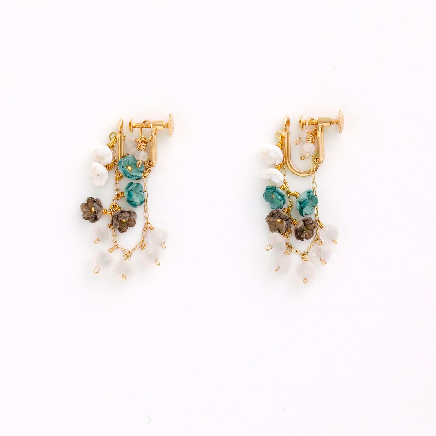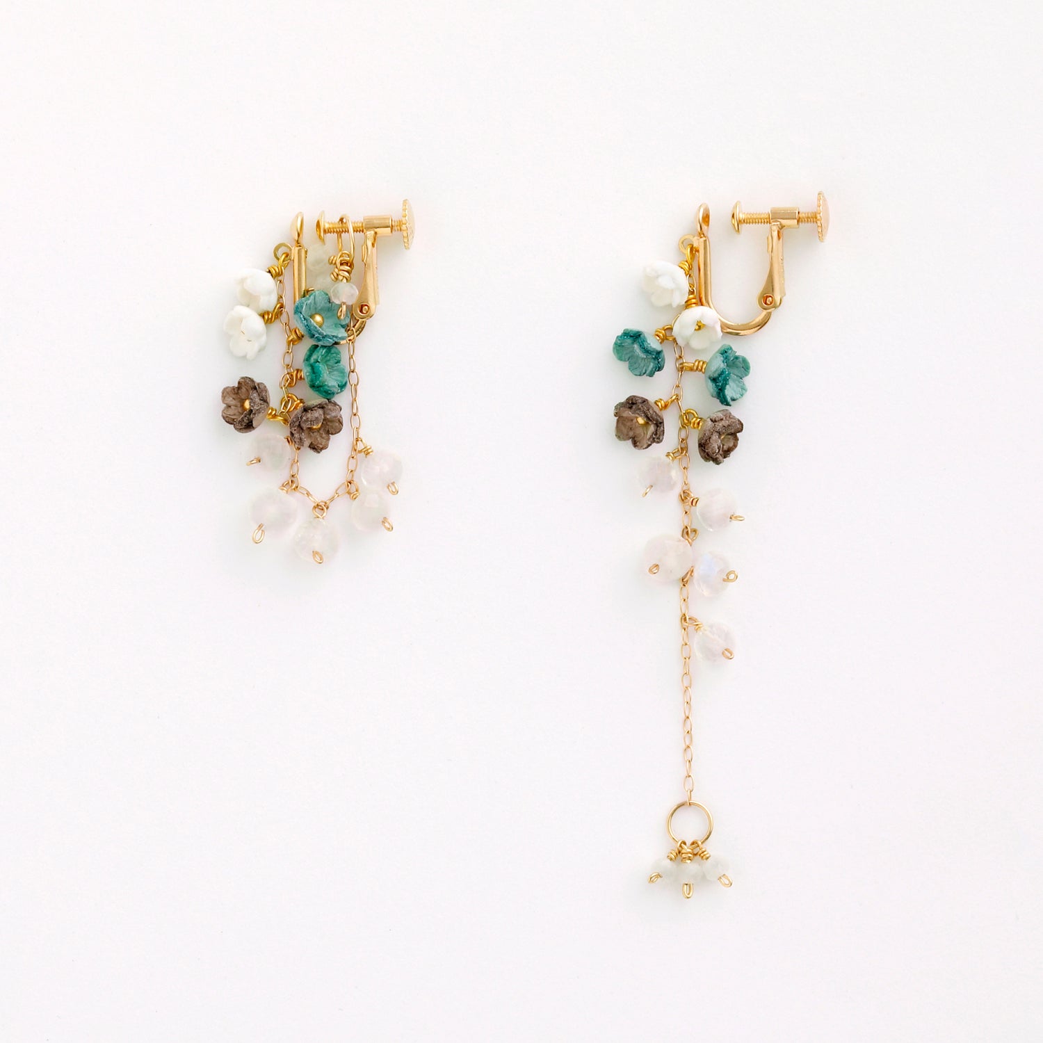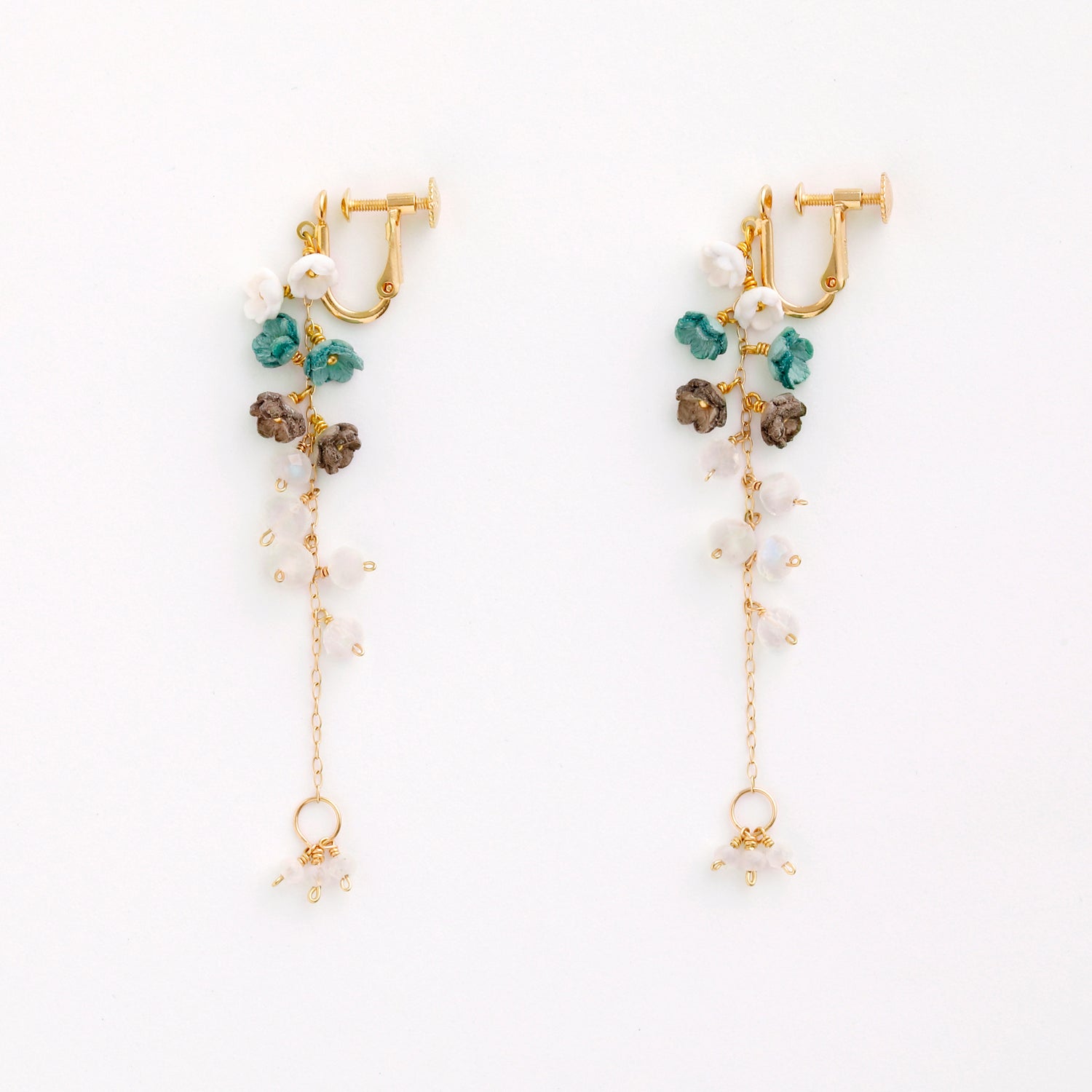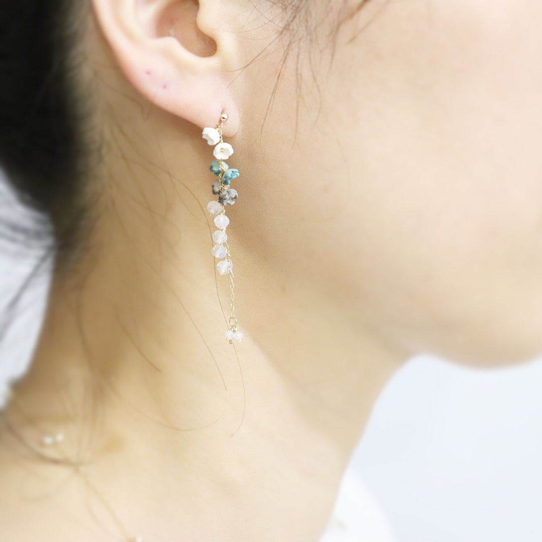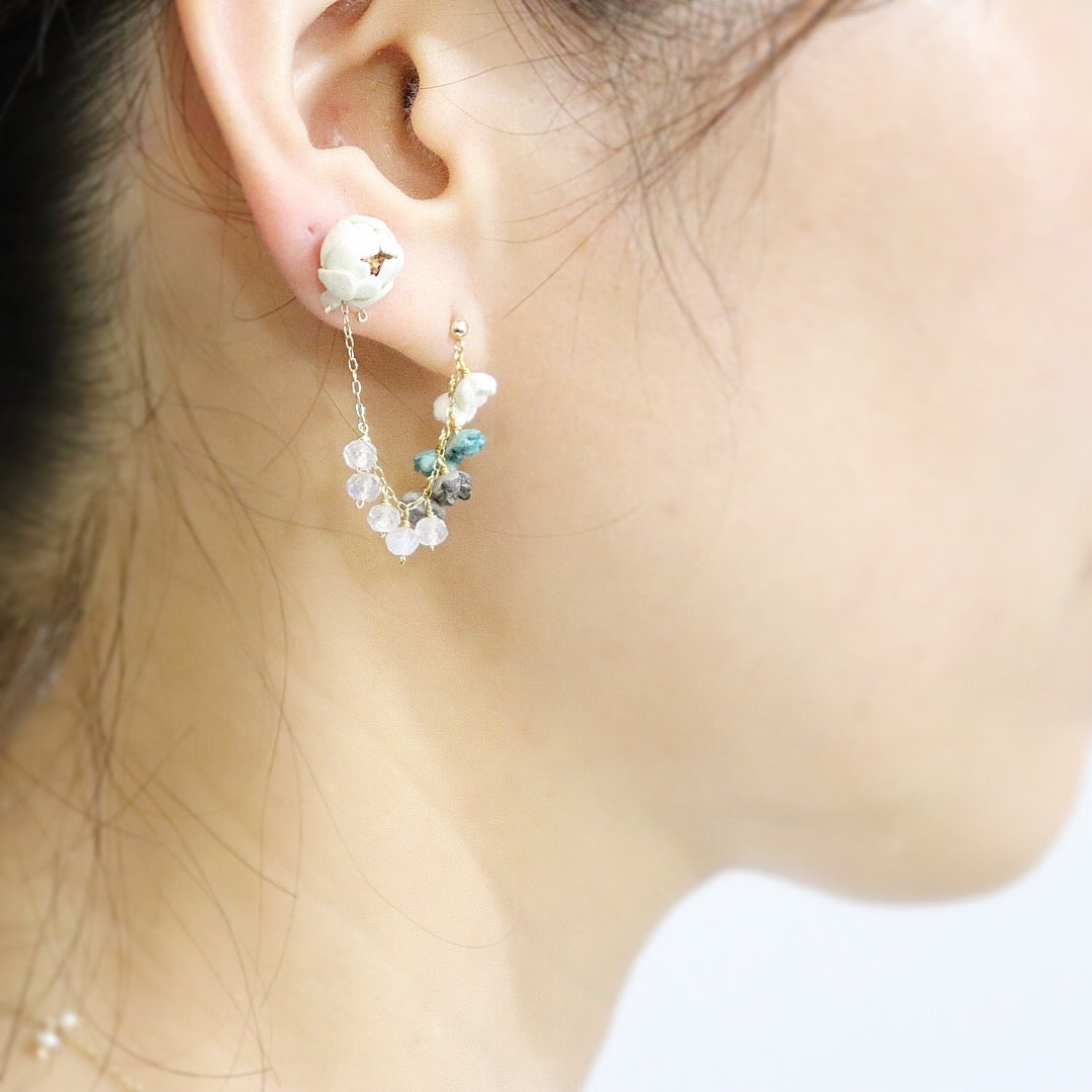 色のお花とムーンストーンのバランスが綺麗なピアス・イヤリング。 2wayで、すっと垂らしたり、下部をピアスポストに通して、半分に折り畳んでもお使い頂けます。ピアスの穴が2つの方は、着用写真のように他のピアスと組み合わせてもお使い頂けます。(※白花ピアスは商品に含まれません)イヤリングも同様、半分に折り畳んでお使い頂けます。 ロングタイプもございます。