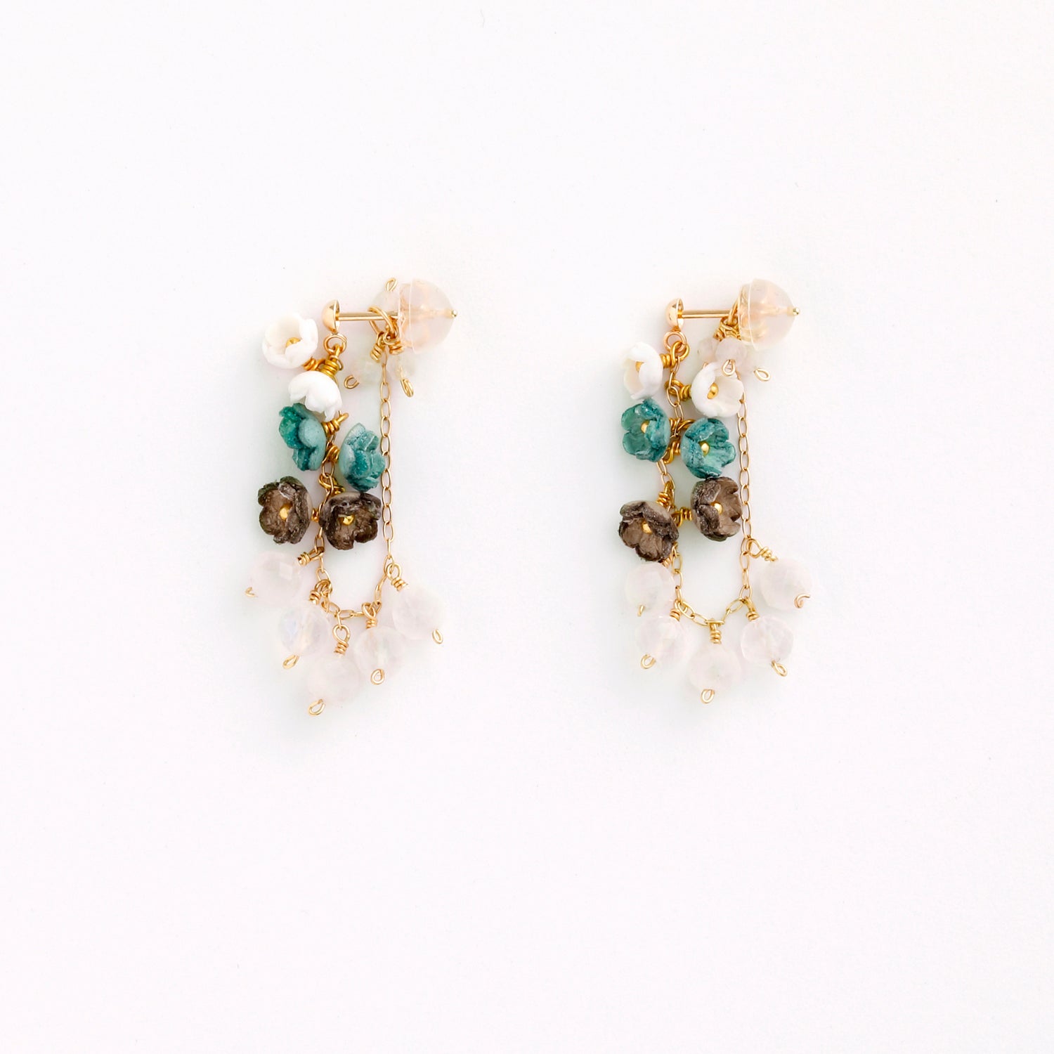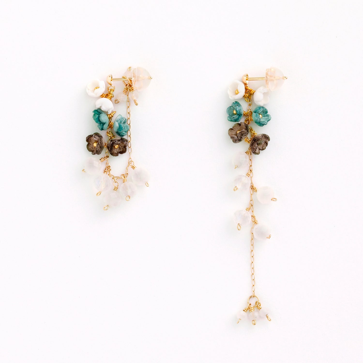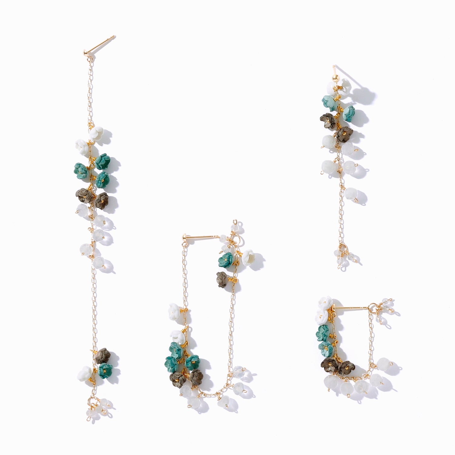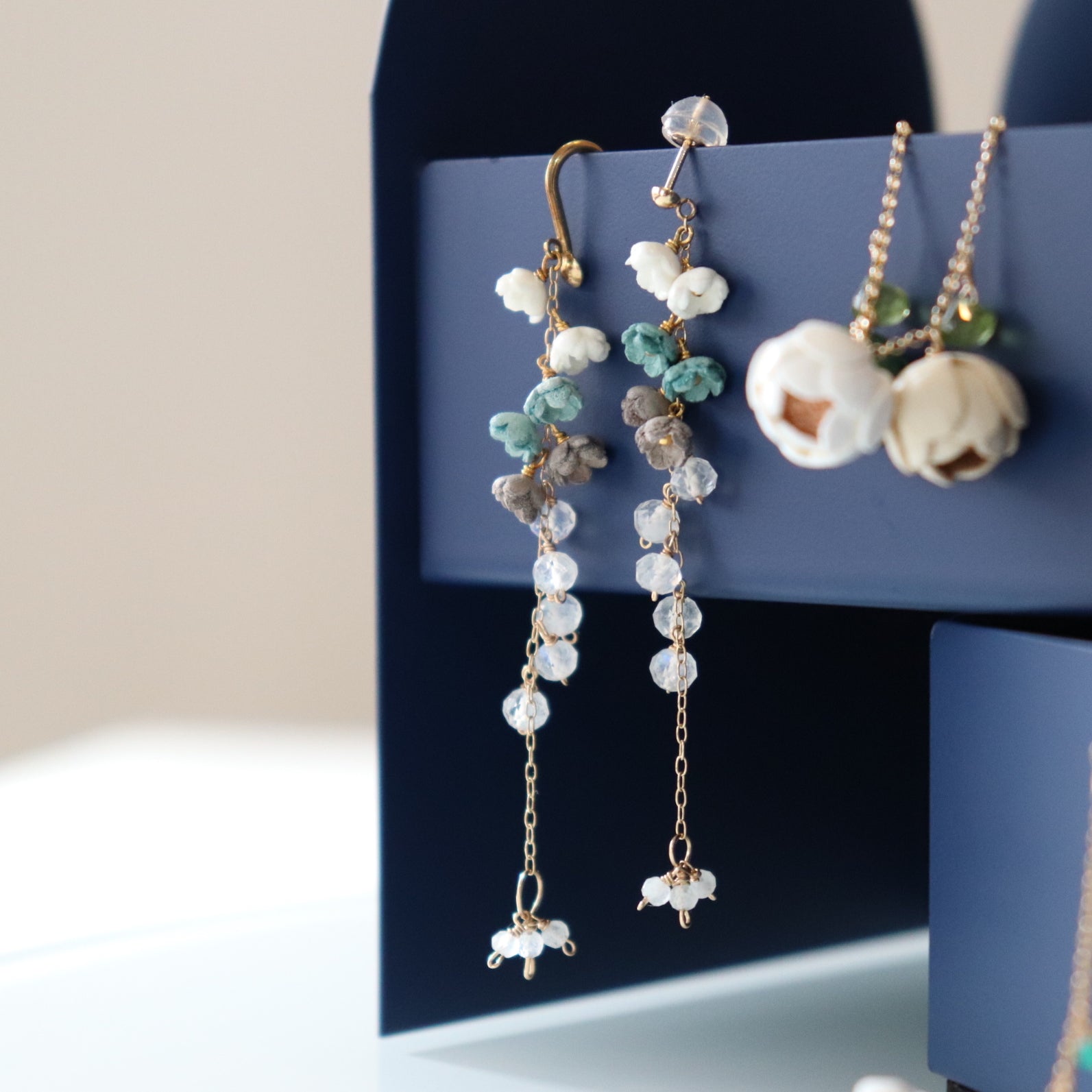 色のお花とムーンストーンのバランスが綺麗なピアス・イヤリング。 2wayで、すっと垂らしたり、下部をピアスポストに通して、半分に折り畳んでもお使い頂けます。ピアスの穴が2つの方は、着用写真のように他のピアスと組み合わせてもお使い頂けます。(※白花ピアスは商品に含まれません)イヤリングも同様、半分に折り畳んでお使い頂けます。 ロングタイプもございます。