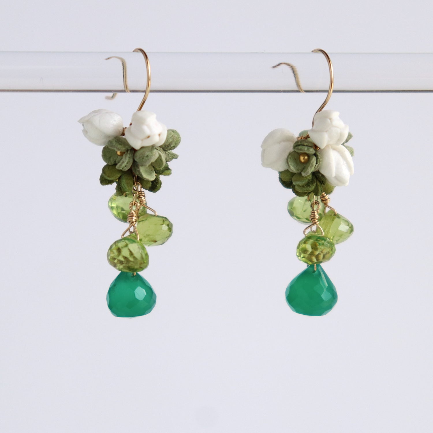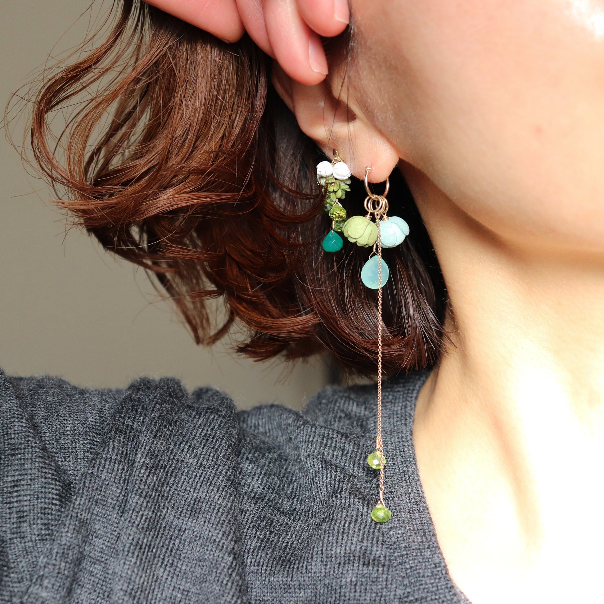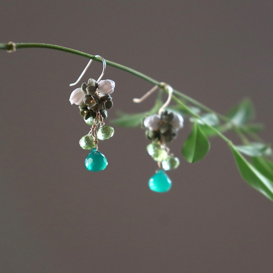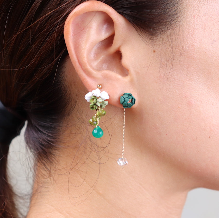 「緑」をテーマにナチュラルなグリーンをメインに用いた「Roku」シリーズ。 2色のグリーンの小花と爽やかな白花の組み合わせです。 天然石ペリドッド、グリーンオニキスは細かなカットで動く度に光を反射します。 全長3cmの合わせやすいサイズ感です。 グリーンのグラデーションをお楽しみください。