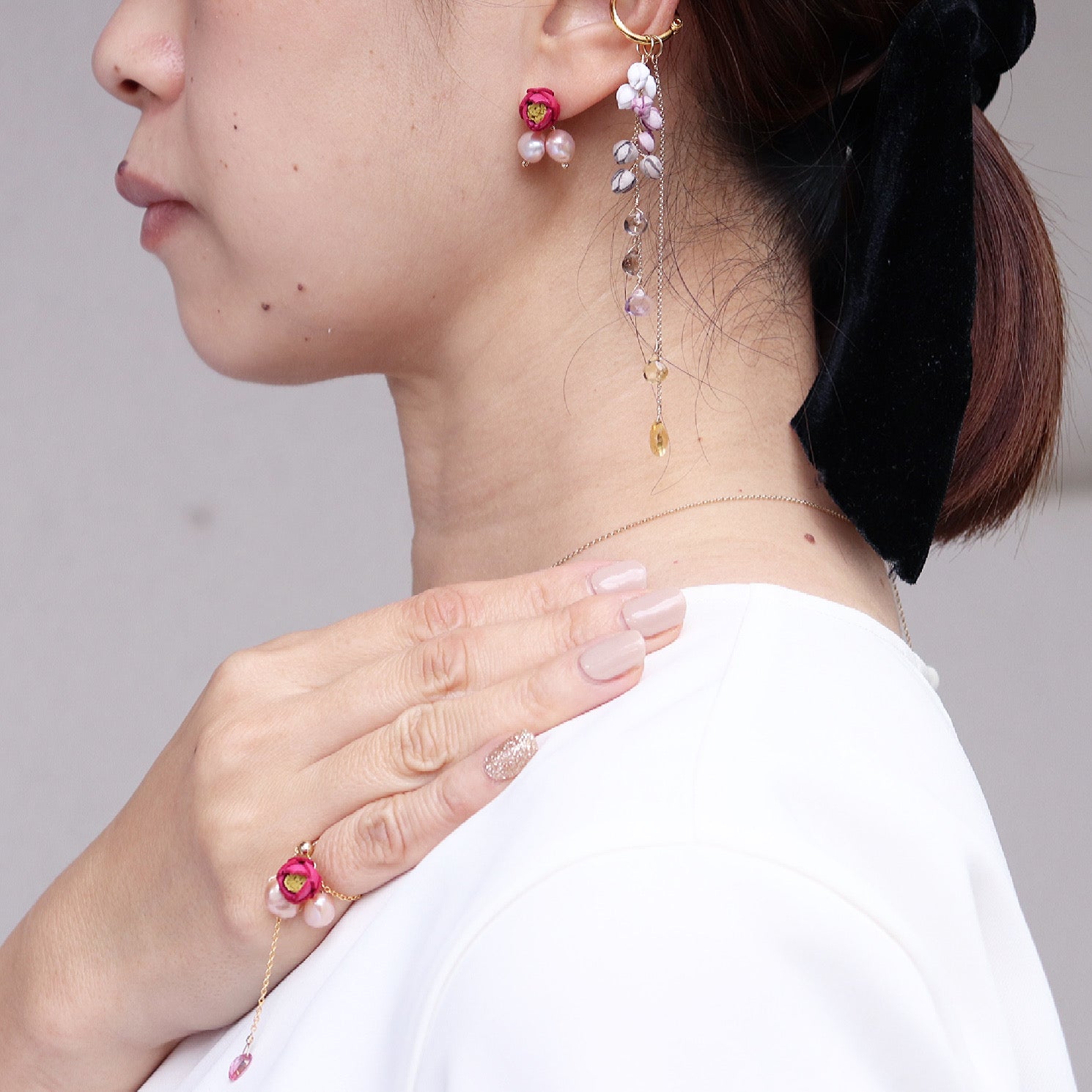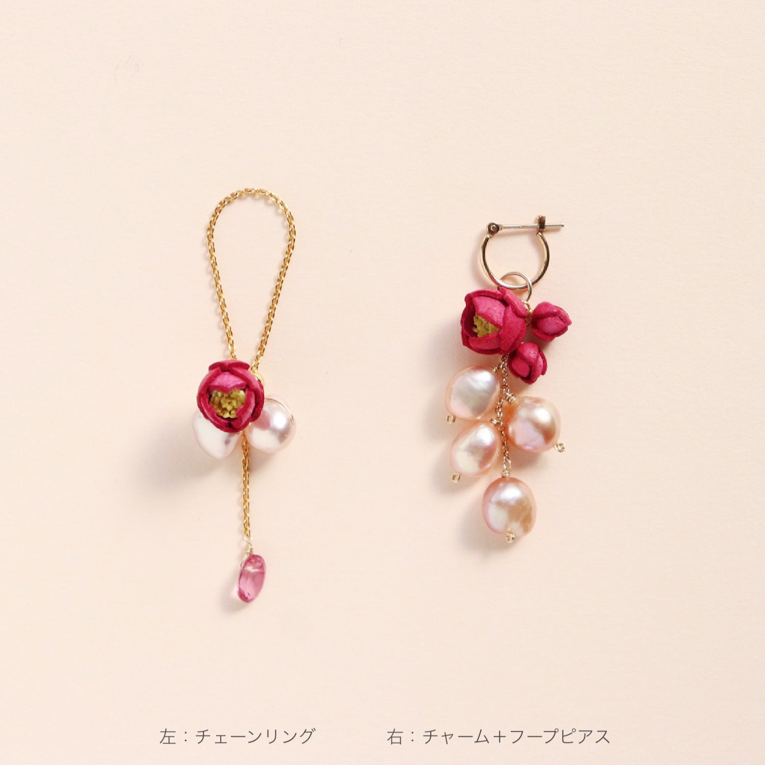 ぽってりとした淡い桜色の淡水パールは、天然の不揃いな形が魅力のバロックパールを用いており、一点一点違う表情がございます。
