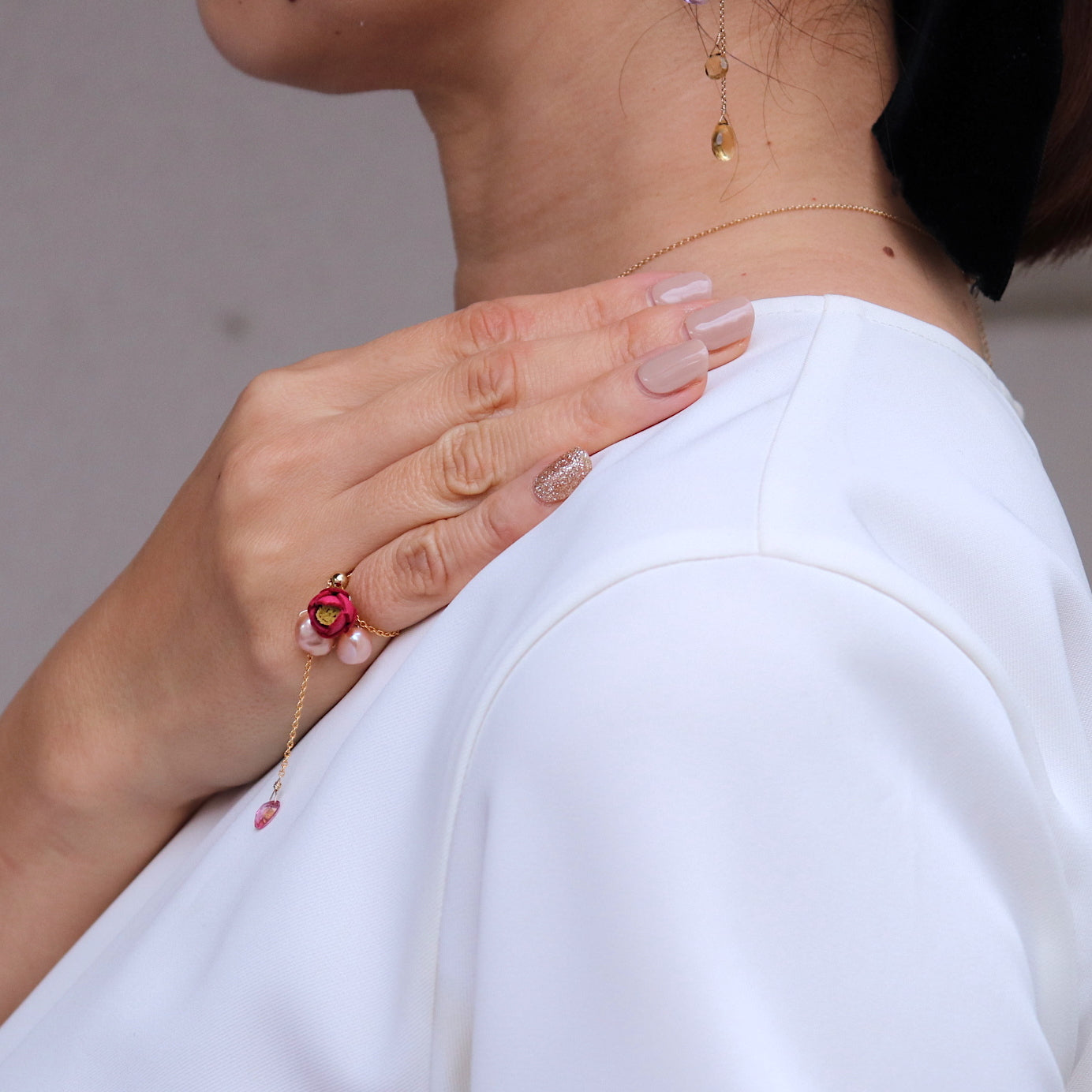 指元でチェーンが揺れて、ピンクトパーズが華やかさを演出してくれます。