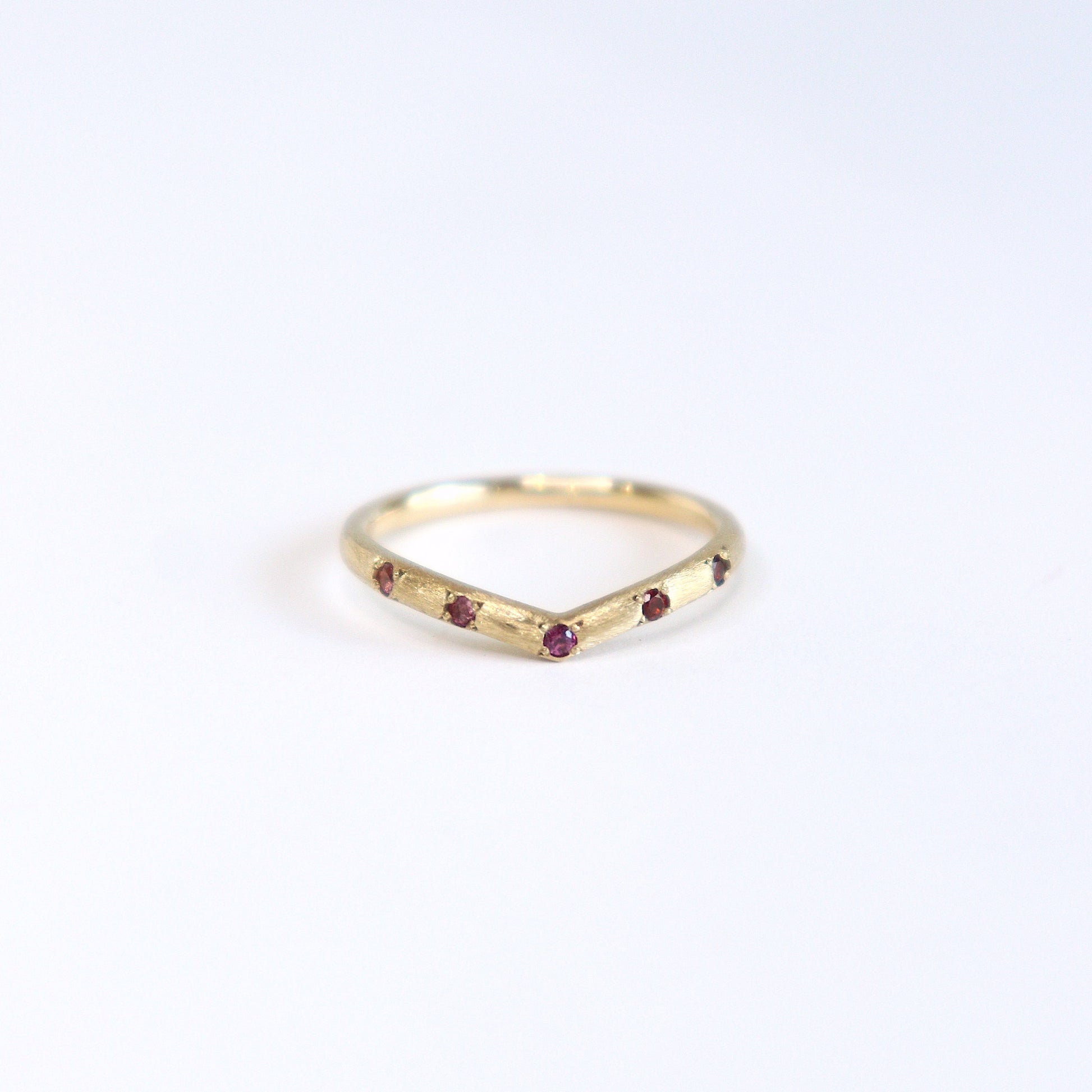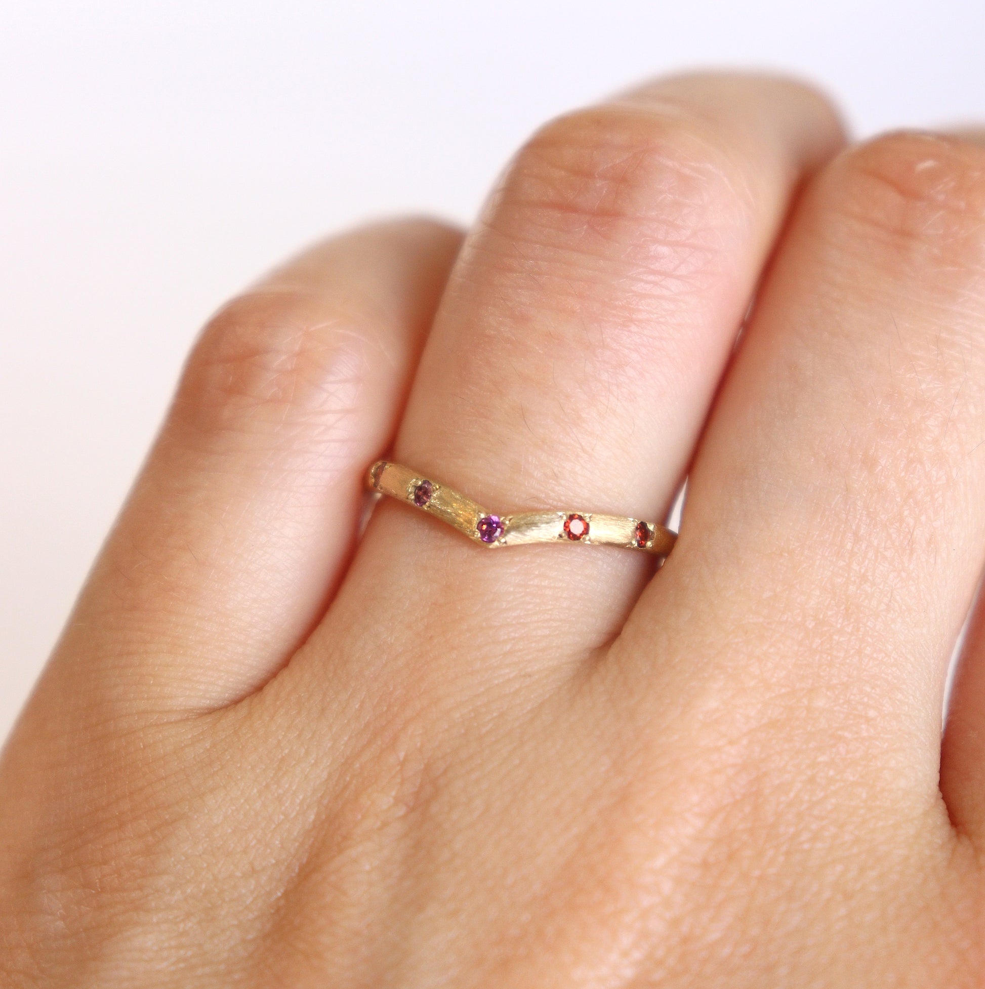 緩やかなカーブのV字リングに、1.5mmラウンド型の3種類の天然石を等間隔に彫り留めをしたデザインリング。表面を少し荒らしたクラフト感が残るマット仕上げで、マットな中にきらりとした光沢が出る個性的な雰囲気です。