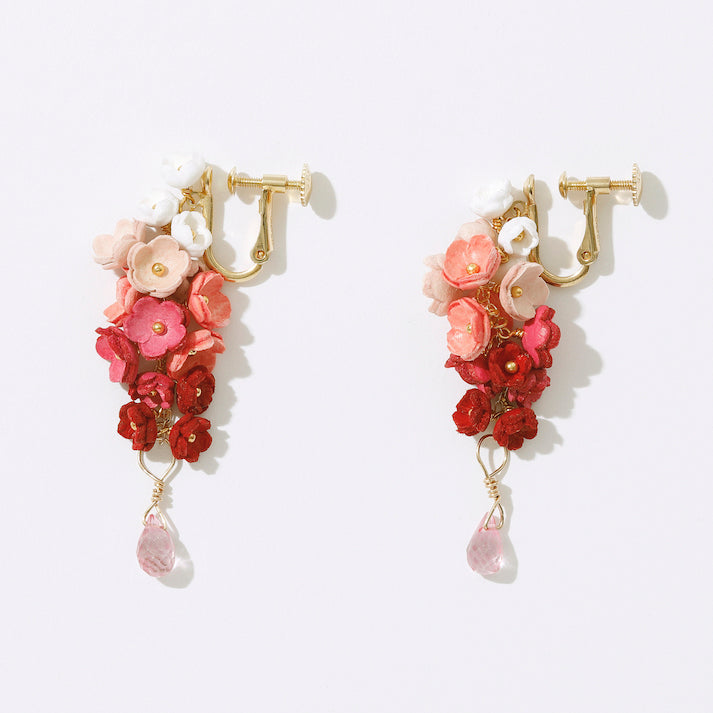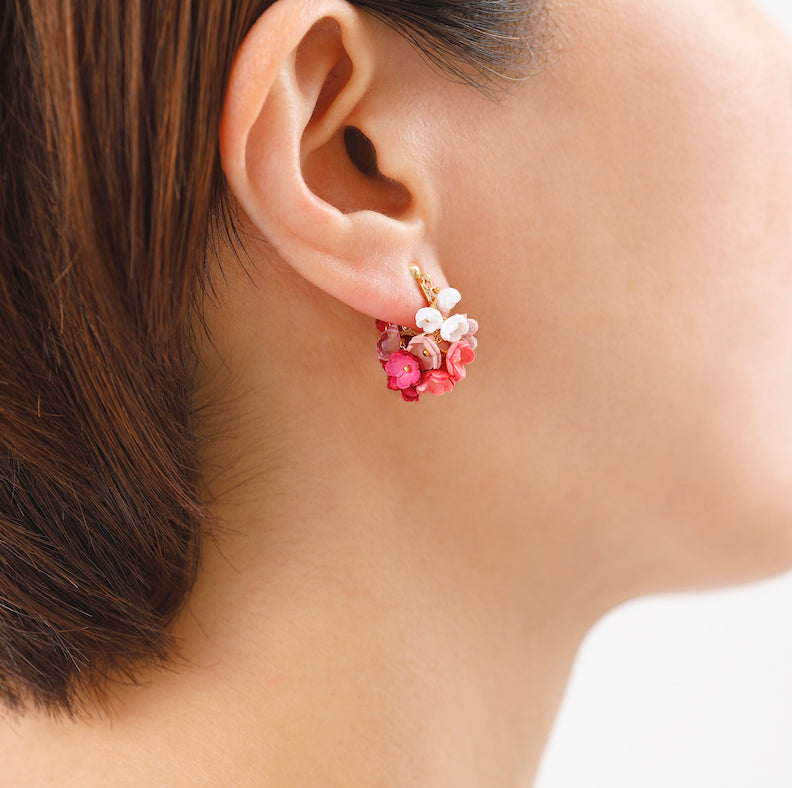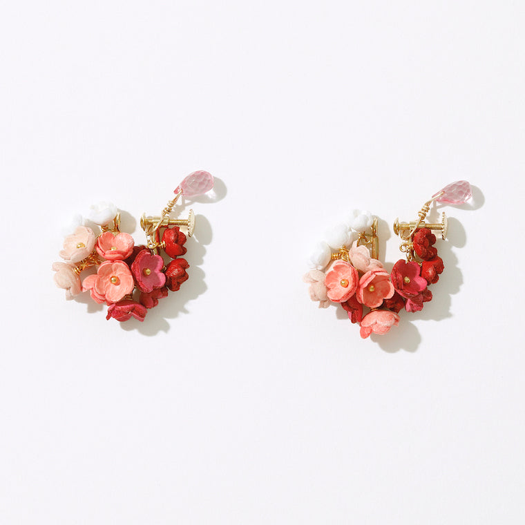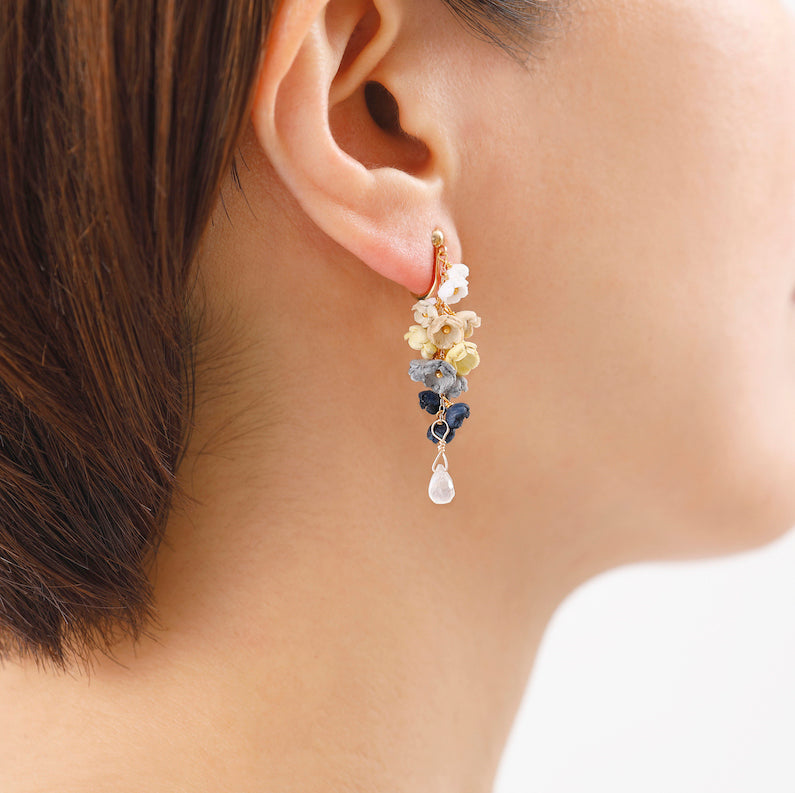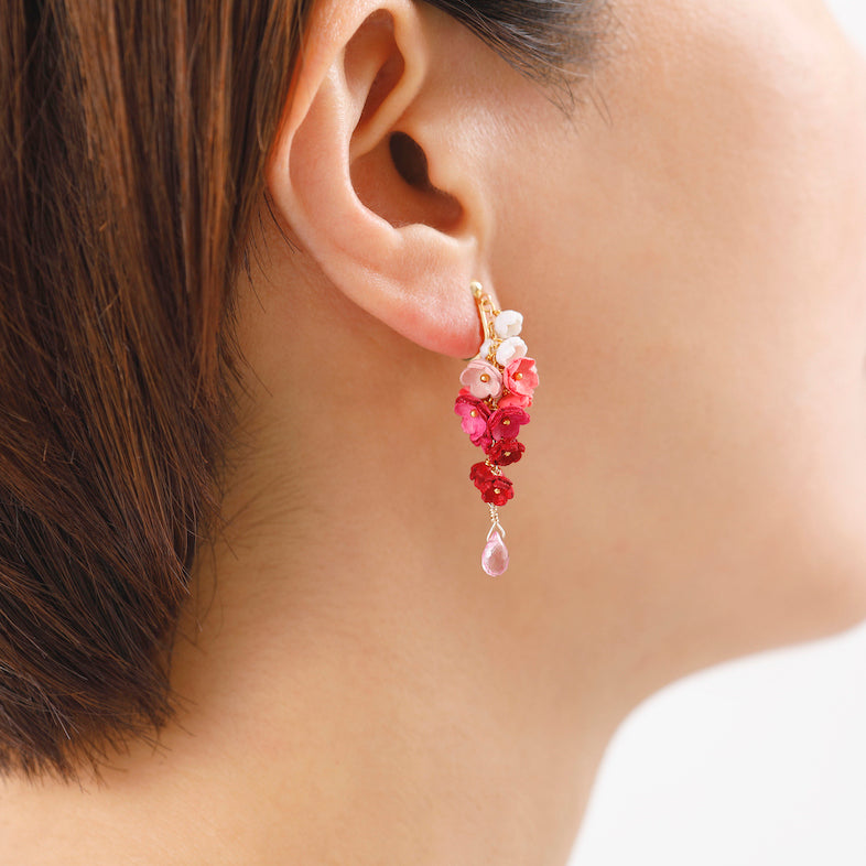 「結」をコンセプトにした「YUI」シリーズのイヤリング。「結」には、「バラバラなものが繋がりあって、一つになる」や「互いに助け合い、協力する仲間」という意味があります。5色の大小のグラデーションの花々が連なり、耳に寄り添うように繋がっていく様を表しました。